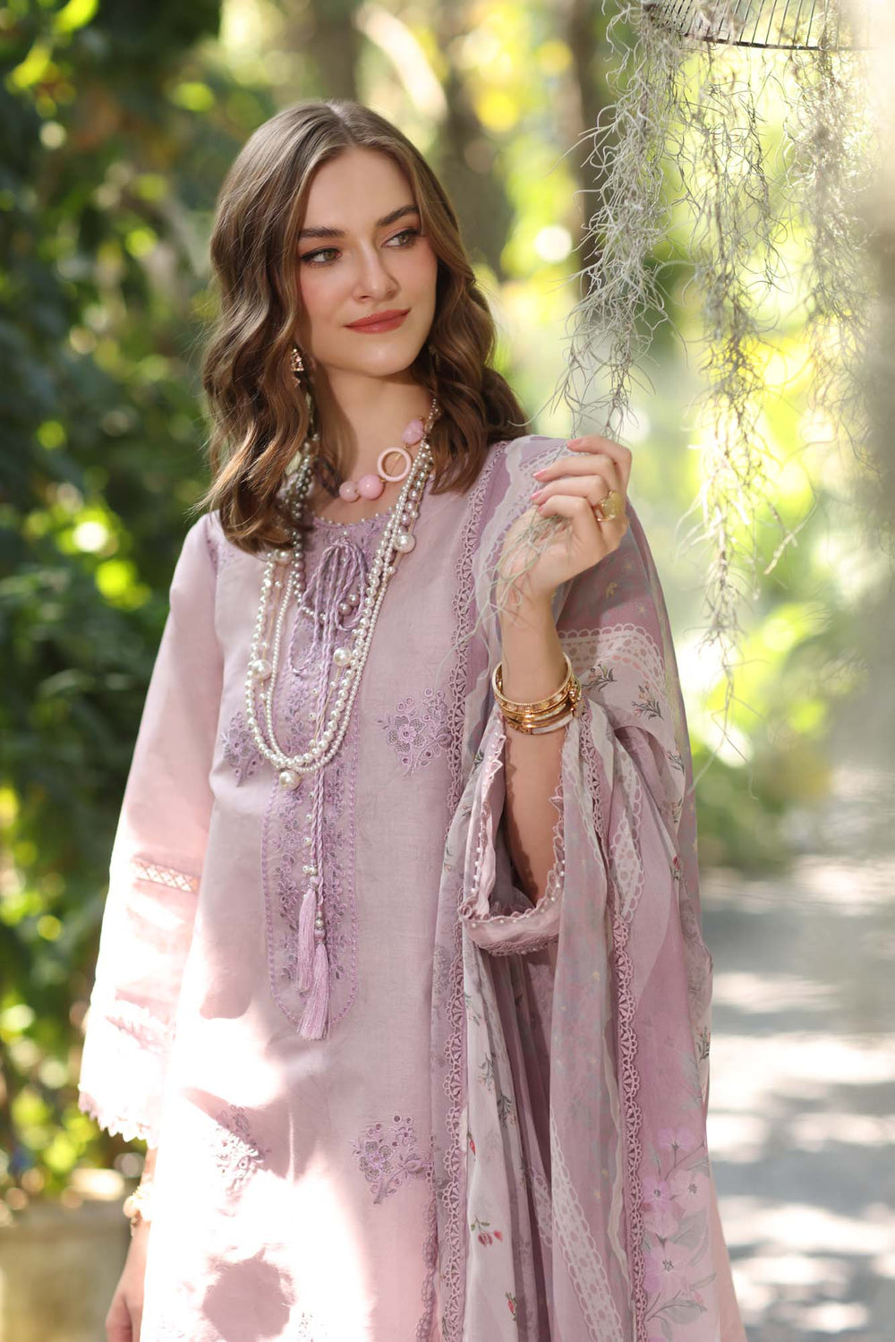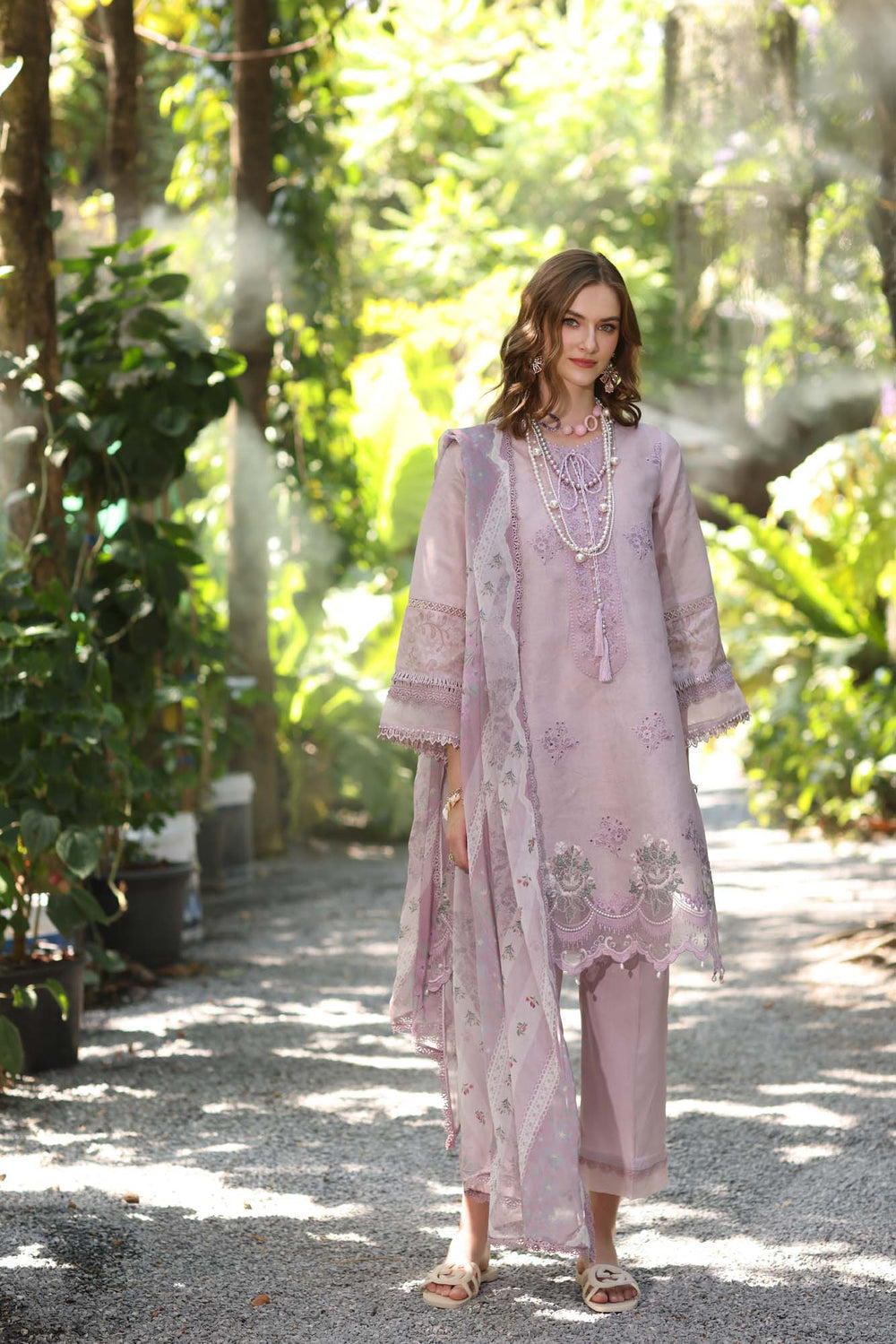 Delighted to present NOOR statement look with the most beautiful combination ever. The lilac meets gorgeous hues of lavender on a stunning digital printed lawn shirt enhanced with beautiful floral schiffli pattern spray. The neckline and lace like embroidered floral hem border for added elegance, is impossible to ignore. Paired with a monotonal chatta patti pattern digital printed chiffon dupatta, this outfit has got to be the happiest and most feel good summer look ever