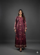 Make a statement in this printed maroon kaftan, featuring a striking blend of cheetah patterns and botanical florals. The rich hues and fluid silhouette exude effortless sophistication, while the unique print adds a modern twist to timeless elegance.