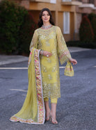 Indulge in luxury with the Noor By Saadia Asad Chiffon Handwork Schiffli Laserkari Collection. This exquisite collection features sequin and laser embroidery on silk appliqued chiffon panels, creating a stunningly intricate design. Complete with a raw silk trouser and digitally printed silk dupatta, this collection is perfect for any special occasion. Experience the elegance and craftsmanship of Noor By Saadia Asad.