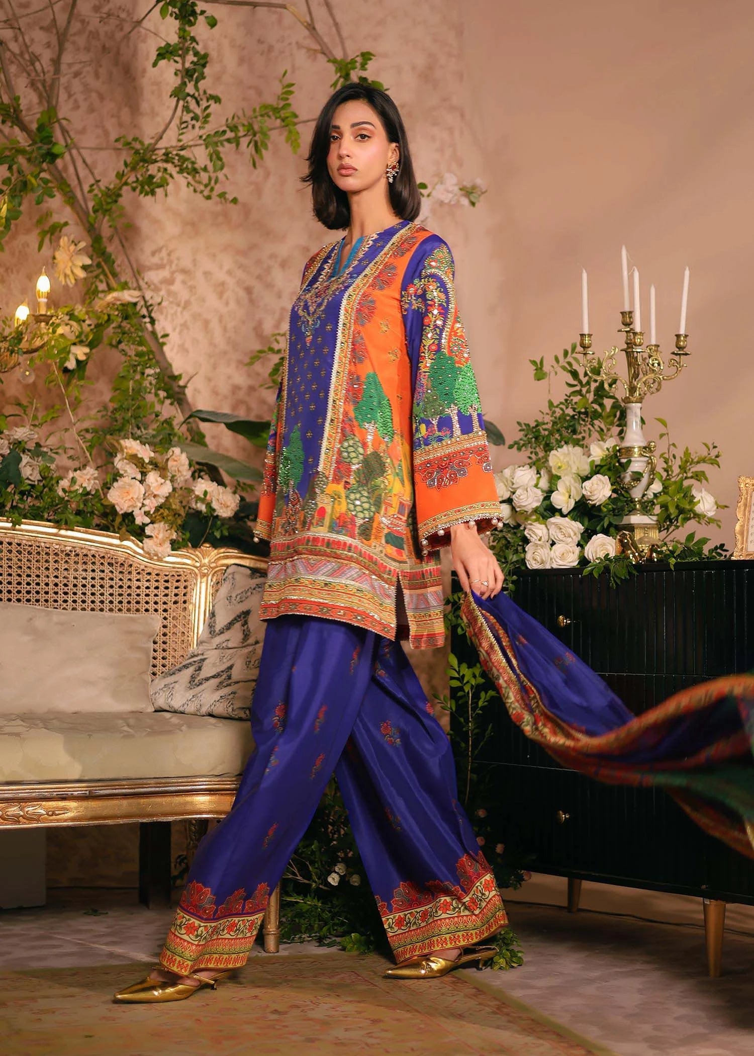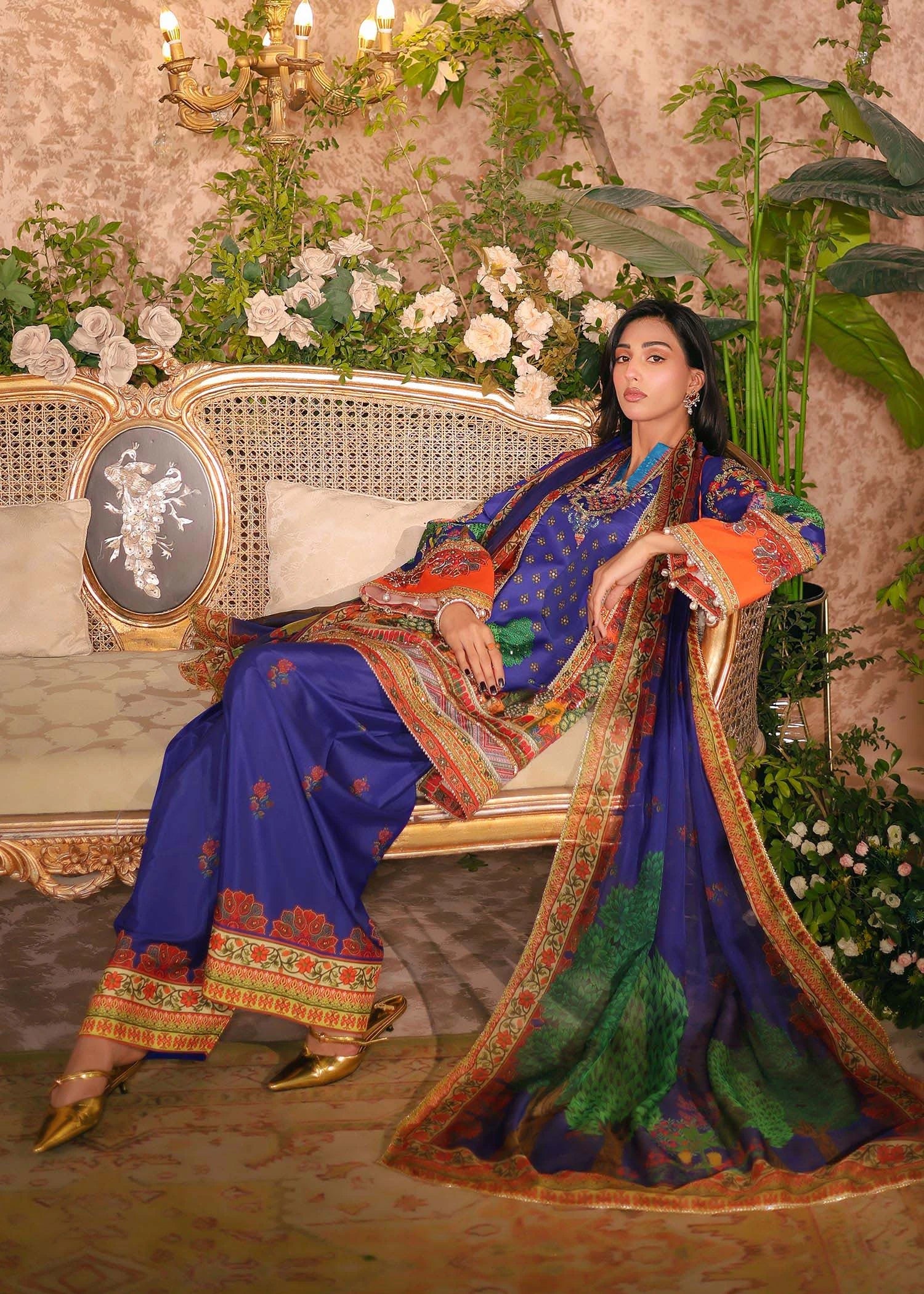 - Grip Silk with sublimation print, elevated by intricate hand embellishments using Baithki, Nakshi, Sitara, Gota, Gota Balls and Lace.