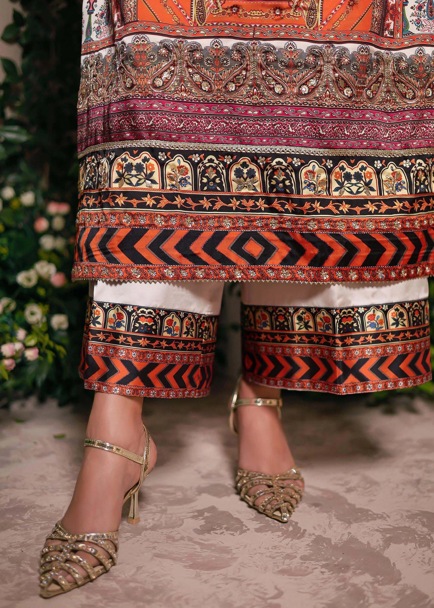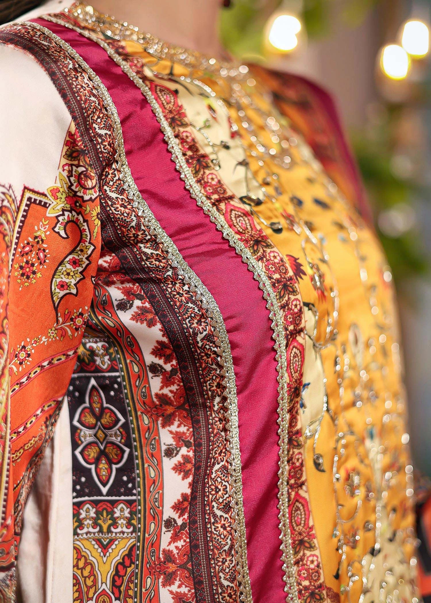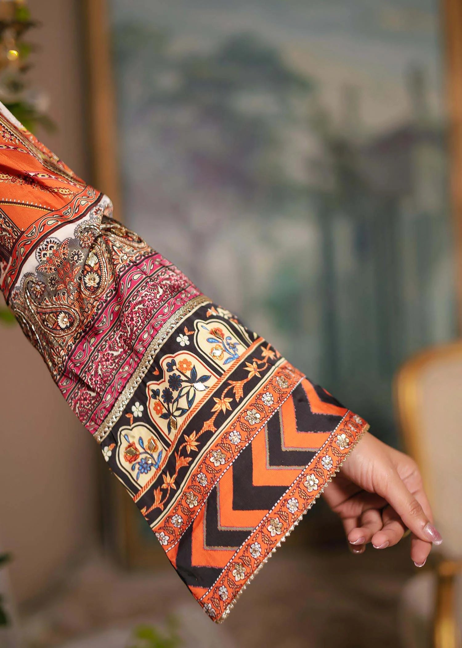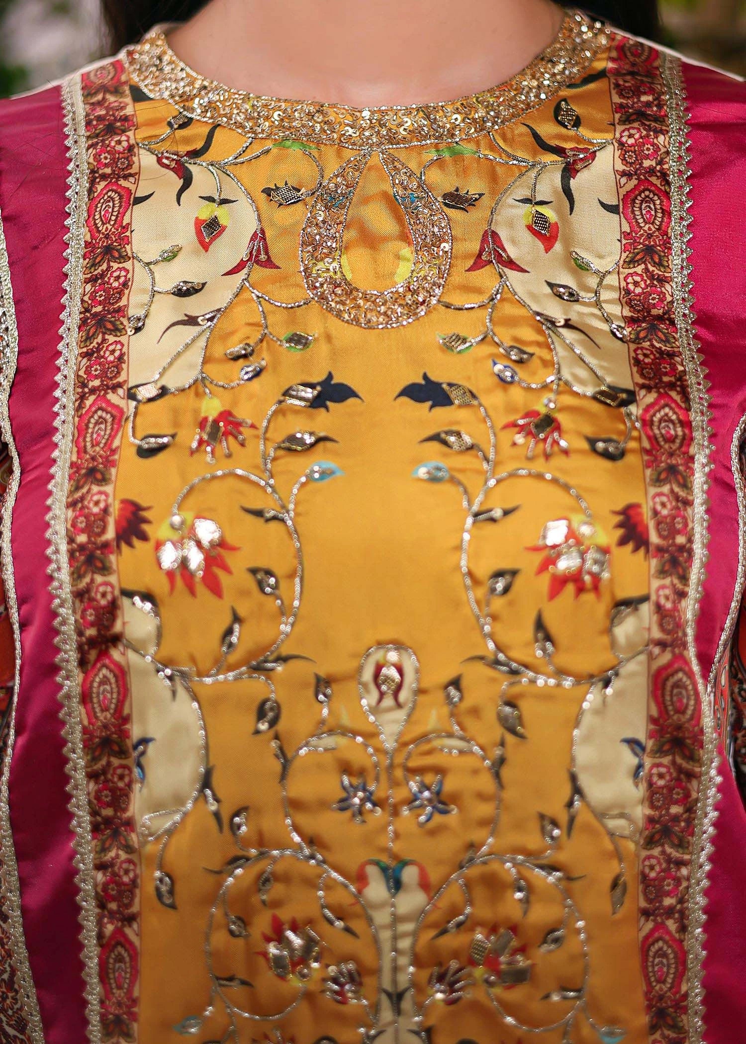 - Shamose Silk with sublimation print, elevated by intricate hand embellishments using Baithki, Nakshi, Gota , Sitara, and Lace.