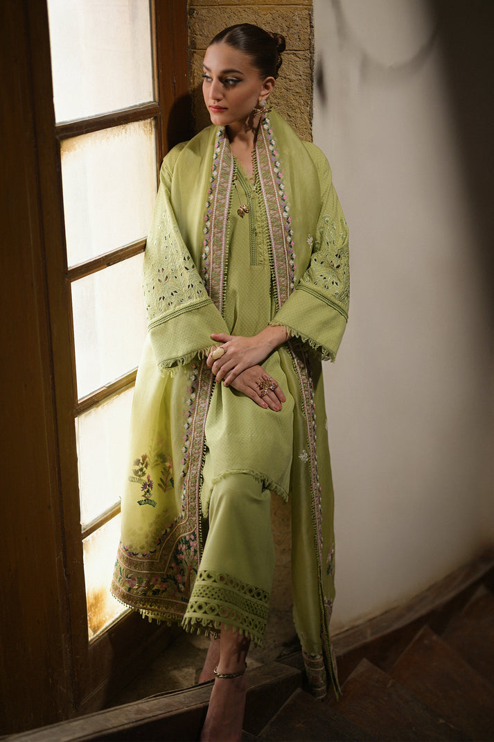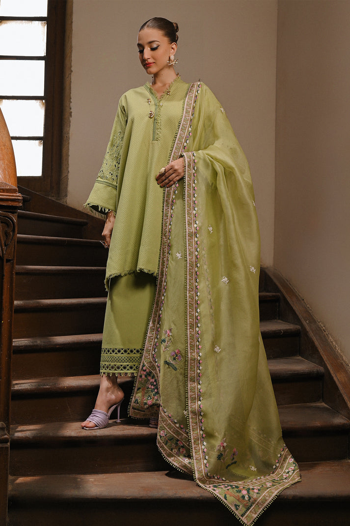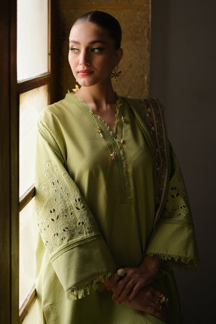 The beautiful pear green shirt has stunning cutwork details on the sleeves, adding a touch of sophistication. The stukish culottes bring a modern and chic element to the outfit. And the embroidered dubata is like a work of art, adding a pop of color and elegance. It’s the perfect outfit for a classy and sophisticated look