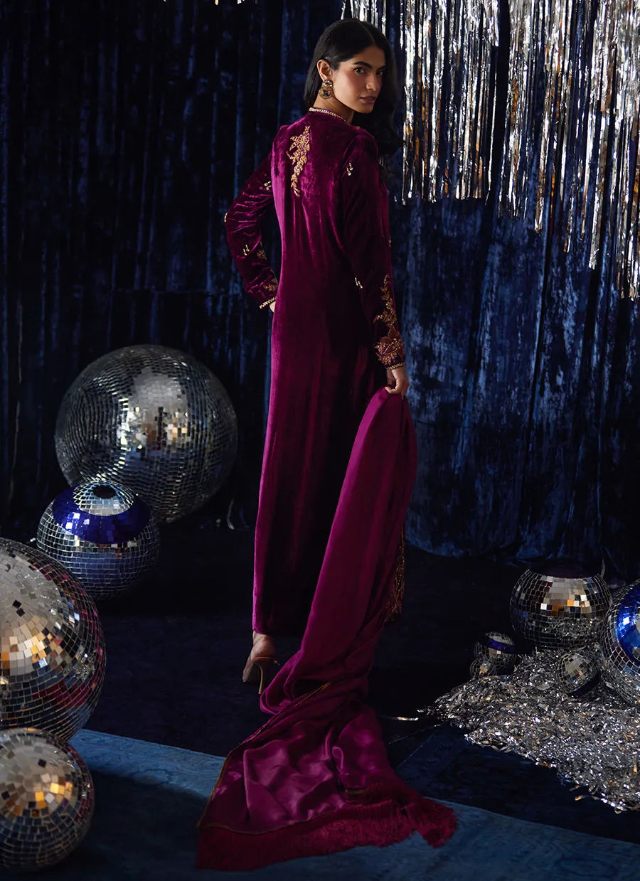A captivating deep magenta velvet shirt adorned with intricate zari motifs, plush velvet appliqué, and exquisite zardozi detailing featuring kora, dabka, sequins, and crystals along the neckline and side slits. The ensemble is paired with a pure raw silk izaar edged with zari, and a pure medium silk dupatta, finished with zari borders and thick fringe along the pallu — a look that perfectly balances timeless opulence with modern grace.