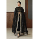 Black Velvet long shirt paired with culottes with badla, tilla, resham and sequin embroidery and a chiffon sequin spray dupatta.