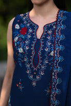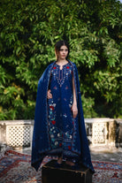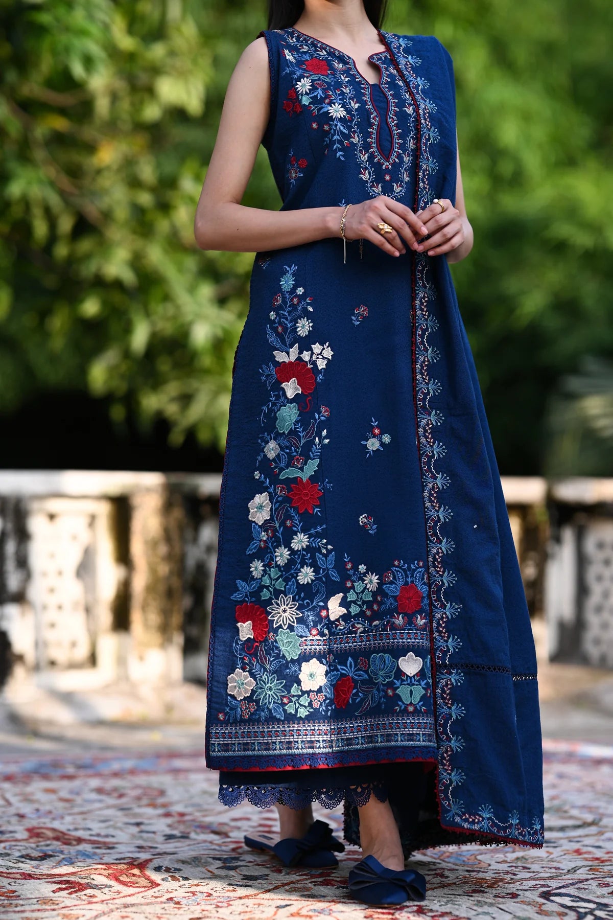 Step out in elegance with this stunning three piece karandi ensemble in a rich, deep blue. The breathable karandi fabric is perfect for transitional weather. The long shirt is beautifully adorned with intricate multi-color embroidery featuring floral motifs along the hemline and neckline. It comes paired with a matching plain karandi trouser for a classic silhouette and a coordinating embroidered karandi shawl finished with subtle trim. This outfit is a perfect blend of traditional craft and contemporary style, ideal for evening events or festive gatherings.
