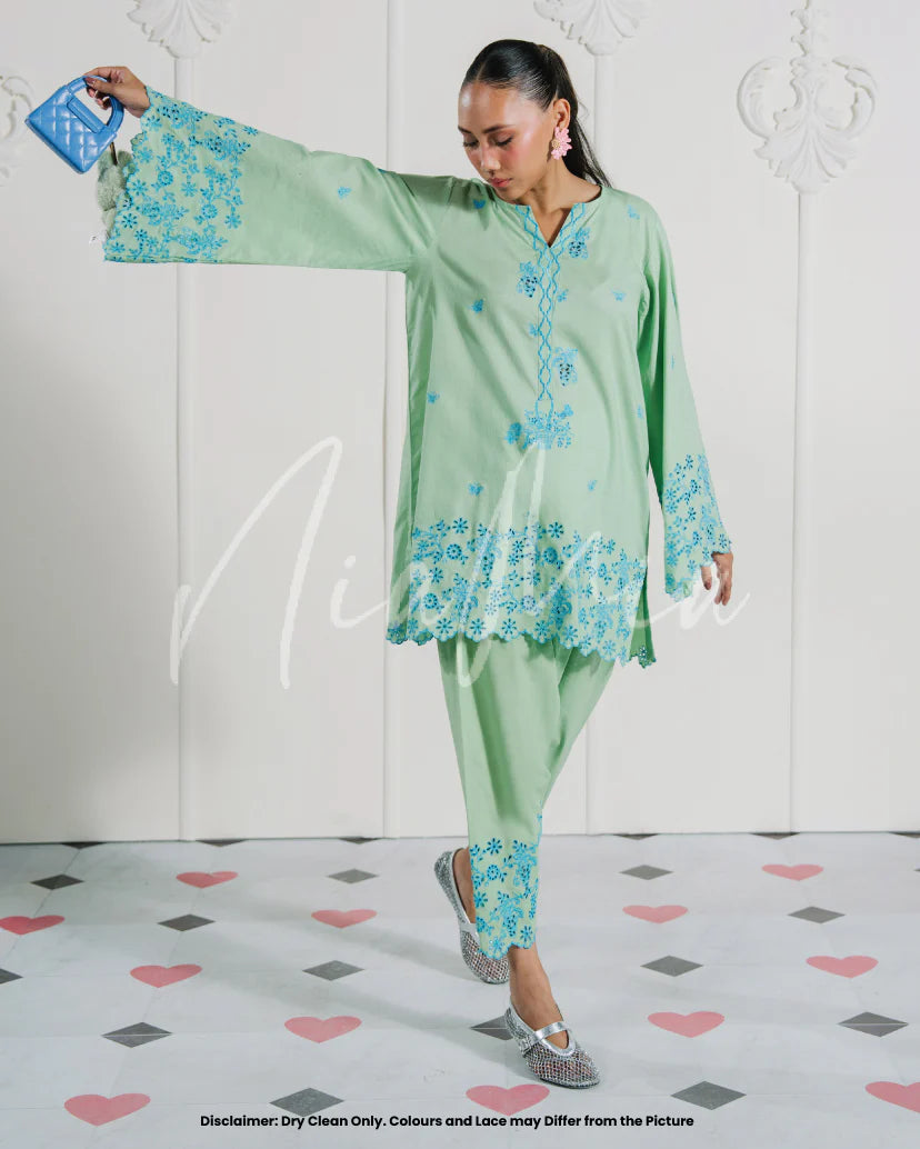 A two-piece embroidered set in refreshing mint green, brought to life with intricate blue floral embroidery. The shirt features a soft V-slit neckline with delicately worked borders on the sleeves and hem, adding a touch of finesse. Paired with matching embroidered shalwar, this look blends cool tones with timeless elegance for a refined summer statement.