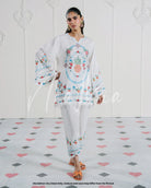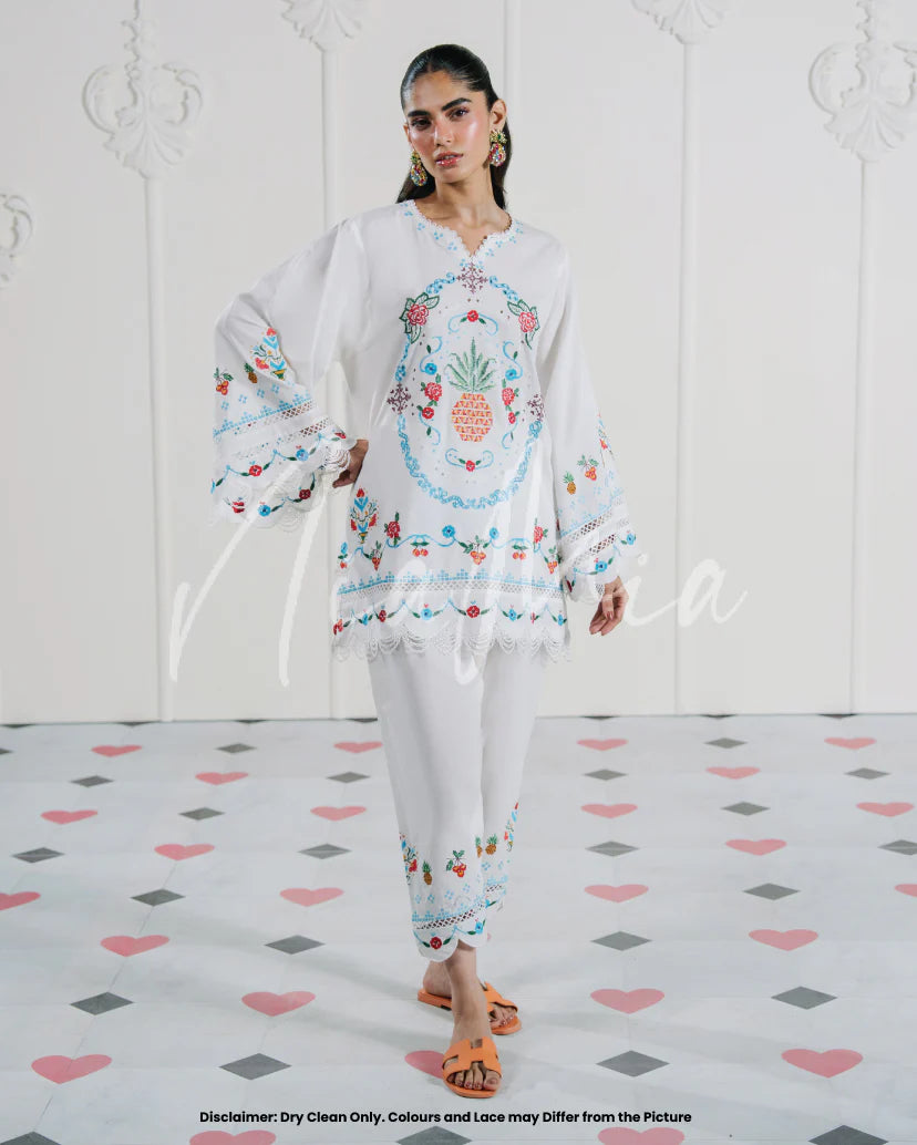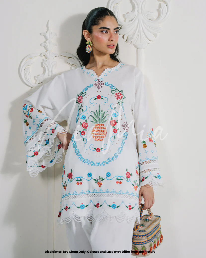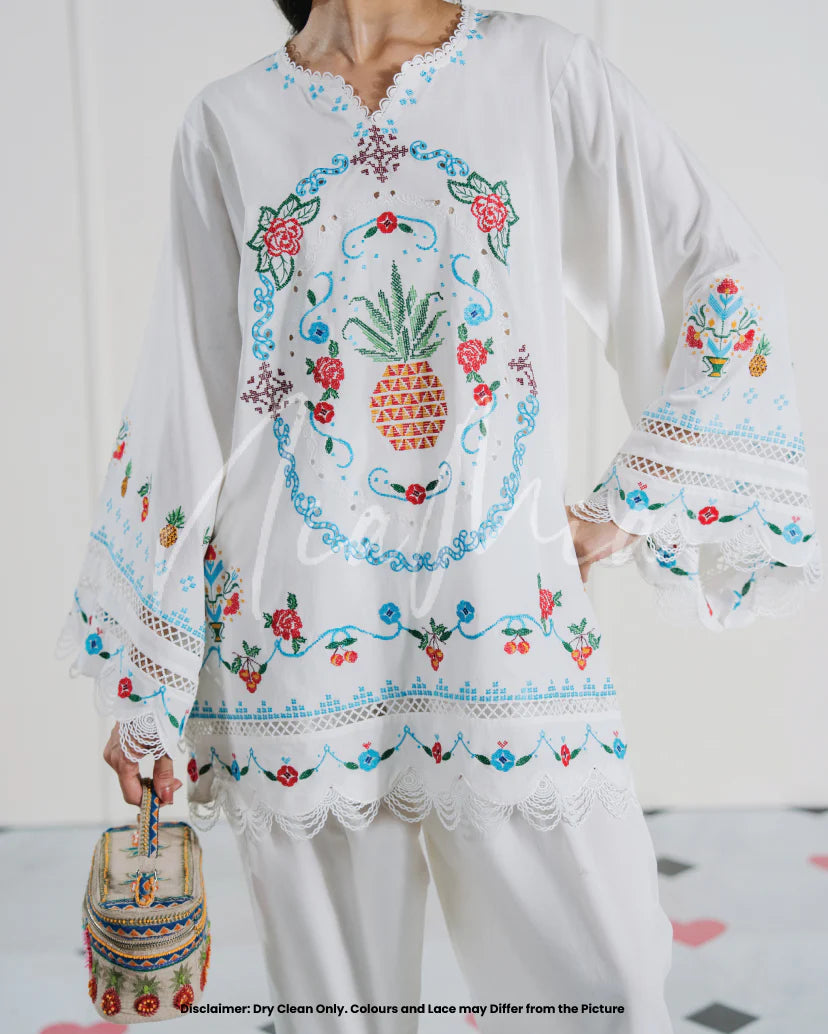 A breezy white lawn ensemble adorned with vibrant cross stitch embroidery, showcasing delicate florals and a bold pineapple motif at the center. The look is completed with a coordinating skinny shalwar featuring matching embroidered accents.