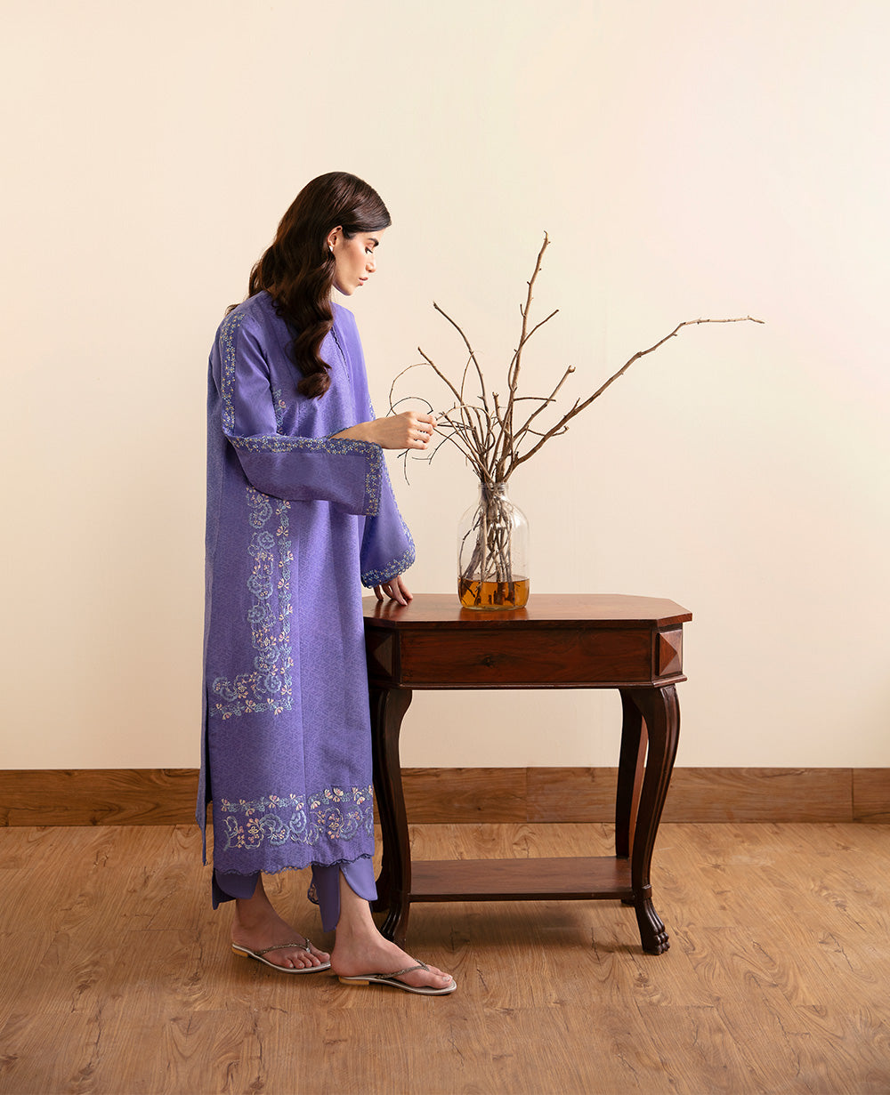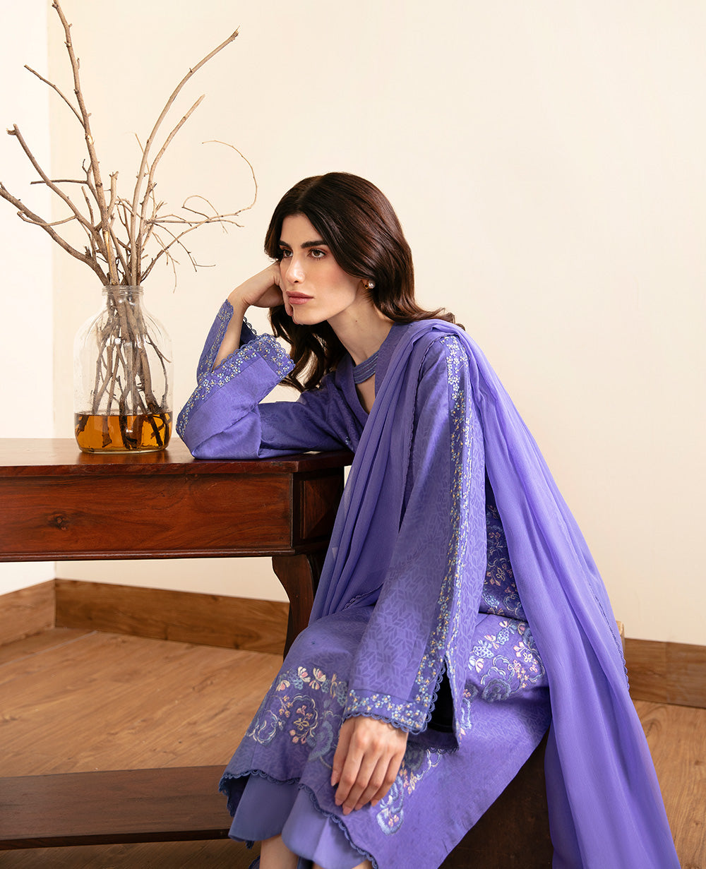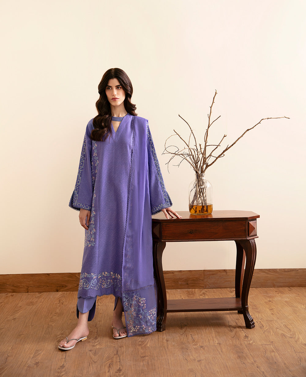 In delicate dusty lavender, the Vervain dress exudes refined style with a woven dobby-textured shirt adorned in floral embroidery. The V-neckline features elegant topstitching, and the side panels showcase intricate embroidery. The chiffon dupatta, edged in lace, perfectly complements the cambric trousers, while organza embroidery on the sleeves adds a captivating touch.