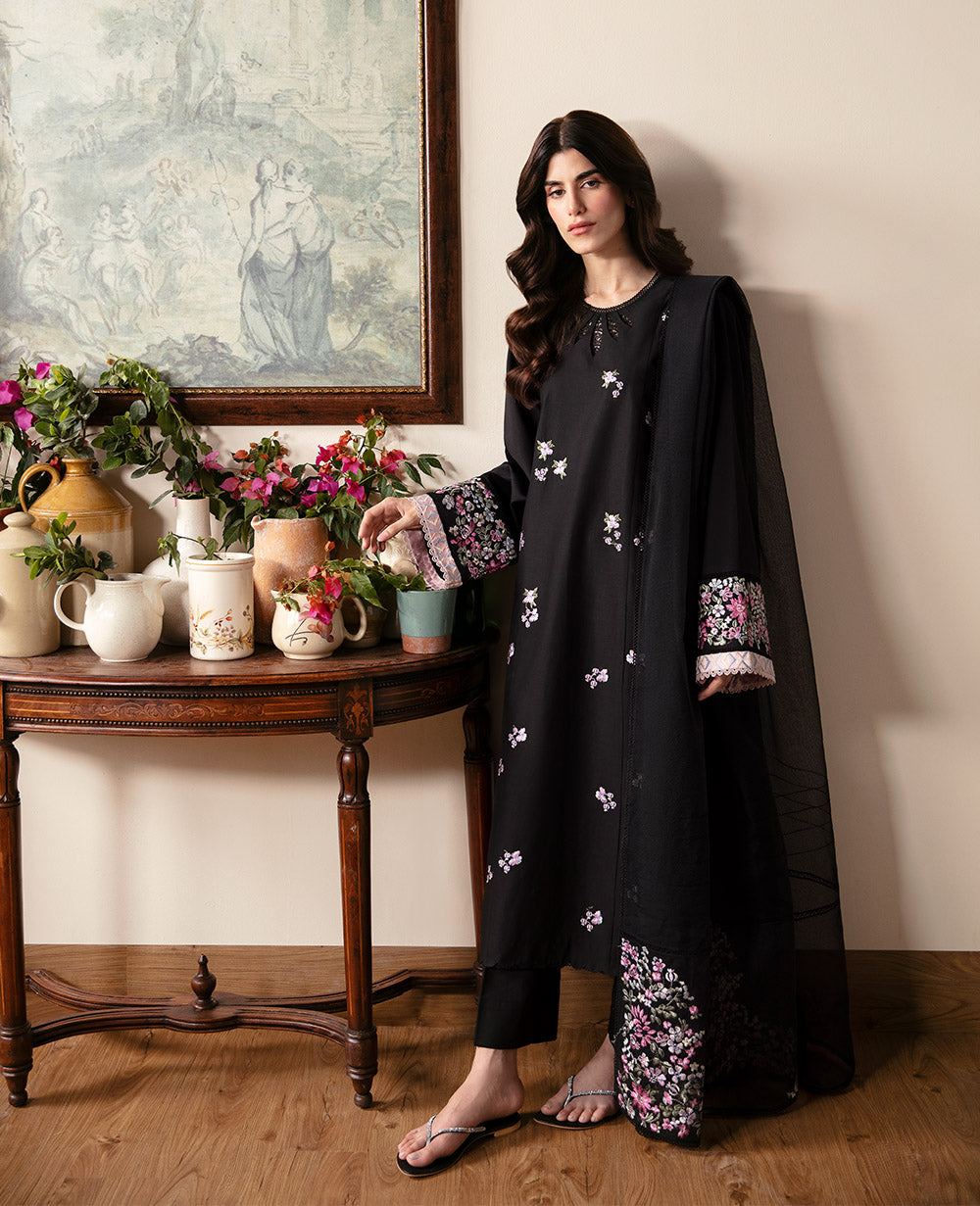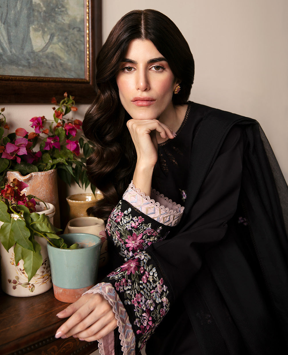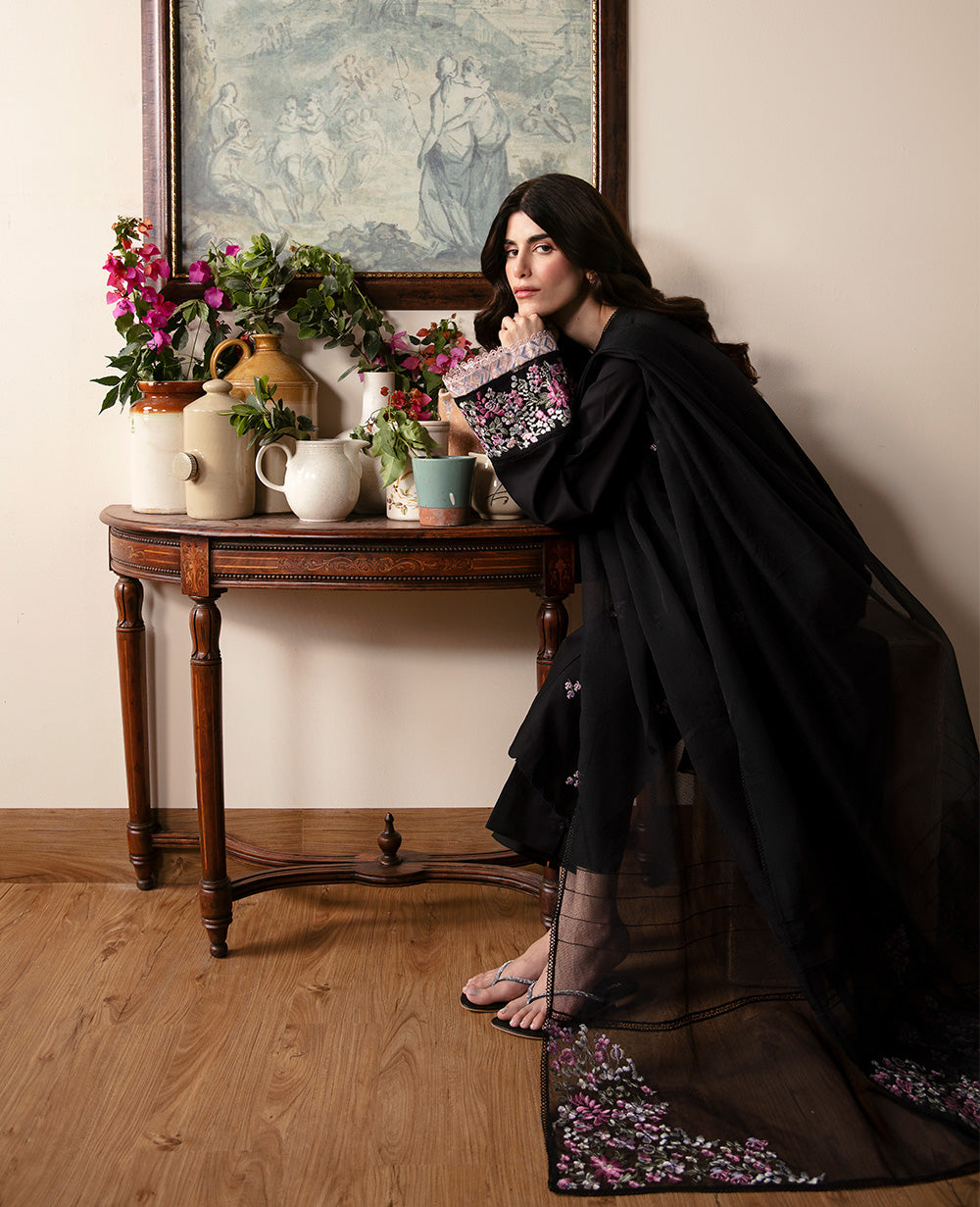 The Calla Lily dress in classic black is a striking statement of elegance, adorned with pastel parsi gara embroidery for a delicate touch. Powder pink embroidery highlights the chevron detail on the sleeves and neckline, while the sleeves and dupatta pallu feature exquisite embroidery borders, elevating this stunning dress with intricate stitching.