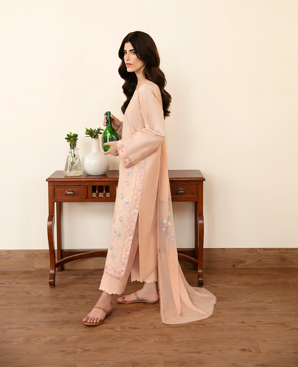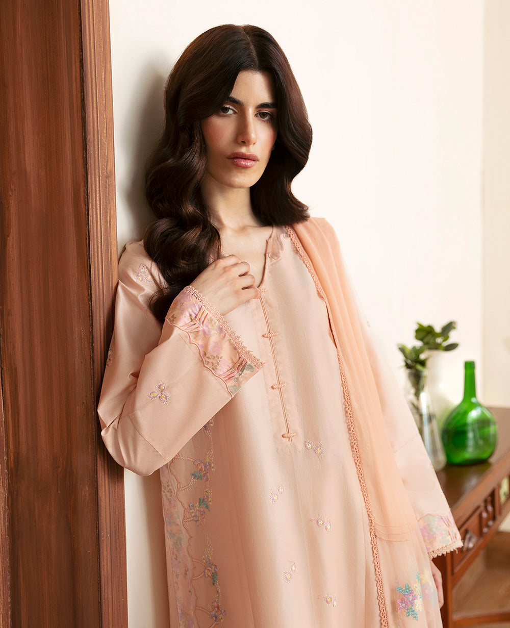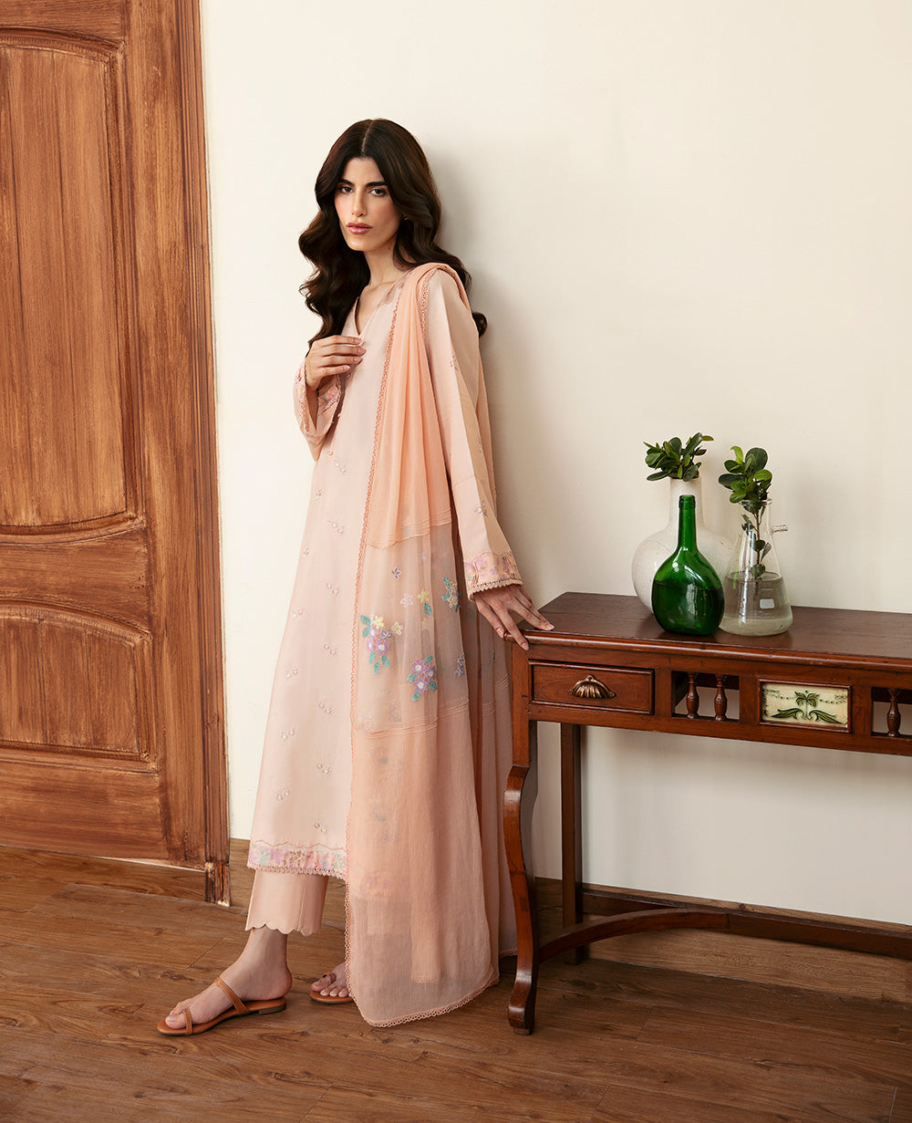 The Gardenia dress, in soft pastel peach, exudes femininity and grace. Its lawn shirt is adorned with pastel embroidery and scallop patterns, while the vivid printed border adds a burst of color. The neckline's organza laser-cut detail and the printed pati pattern with delicate lace on the sleeves complete this visually captivating attire.