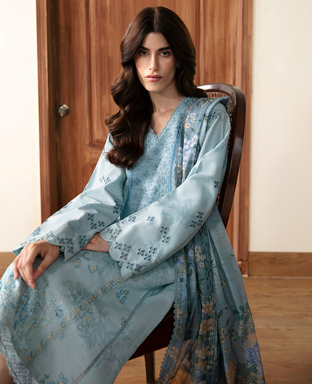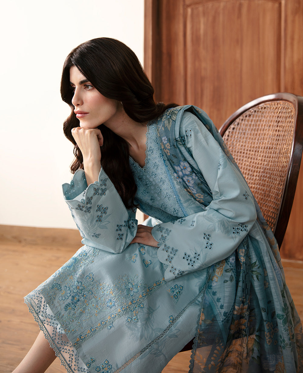 The Calendula dress in stone blue captivates with its woven dobby texture and unique self-print pattern, offering depth and character. Embroidered panel borders add elegance, while the neckline and sleeves feature delicate schiffli. Paired with a slub monar printed dupatta with lace on all sides, this dress is a stunning blend of intricate detail and sophisticated design.