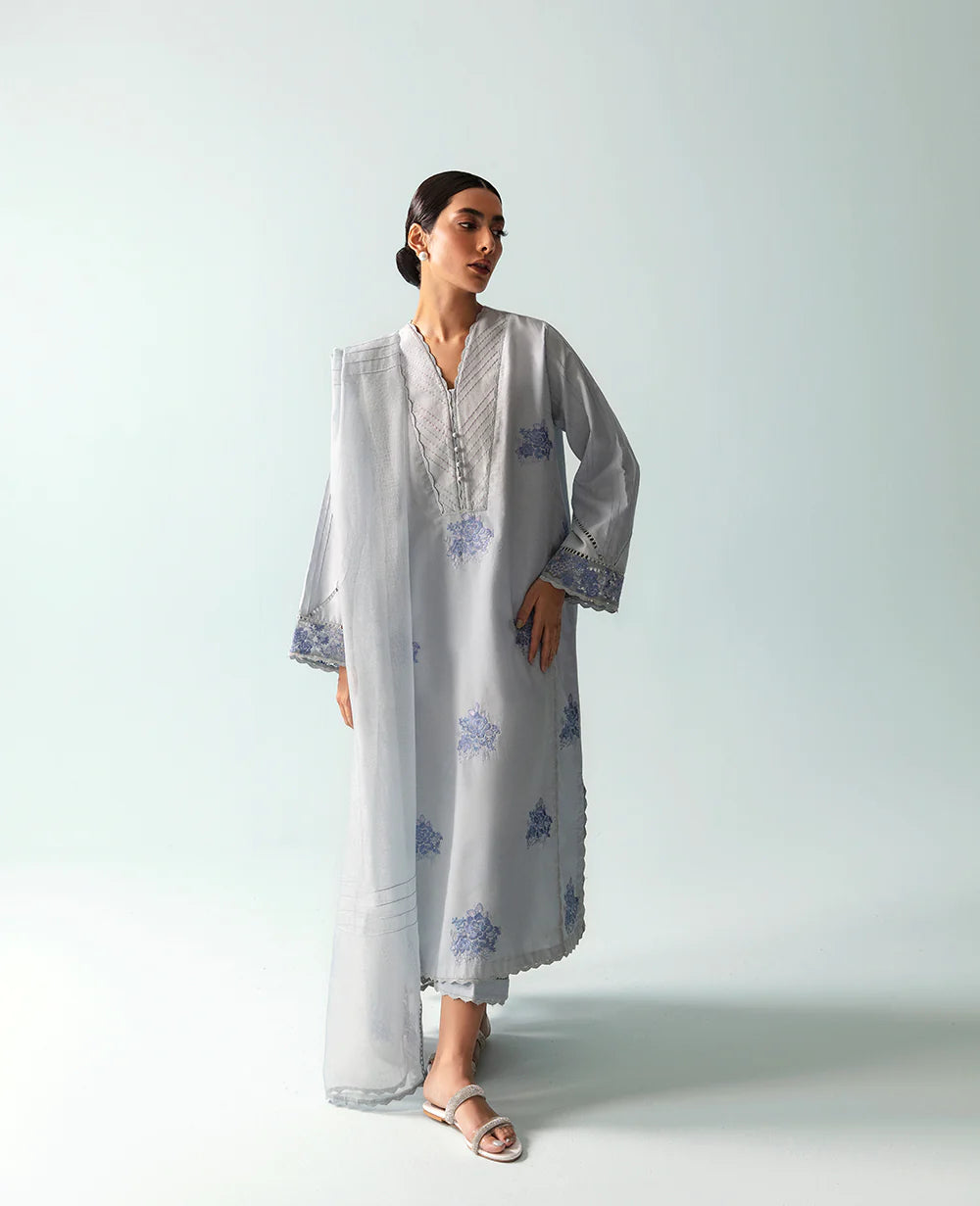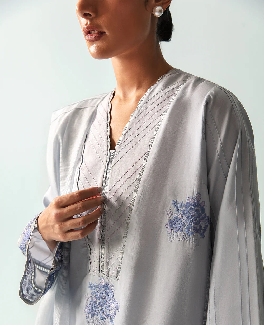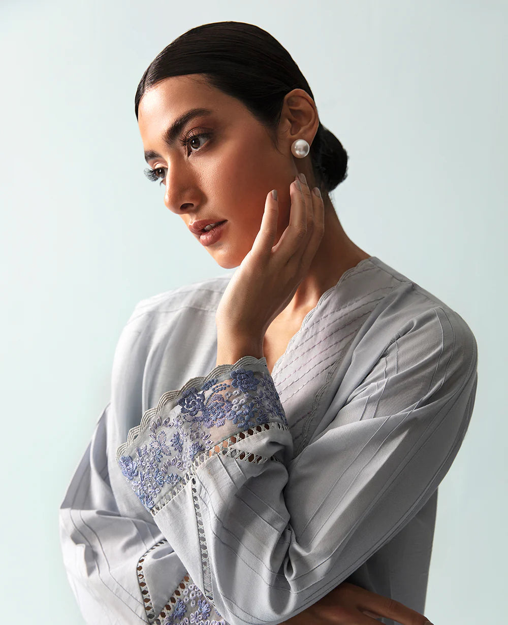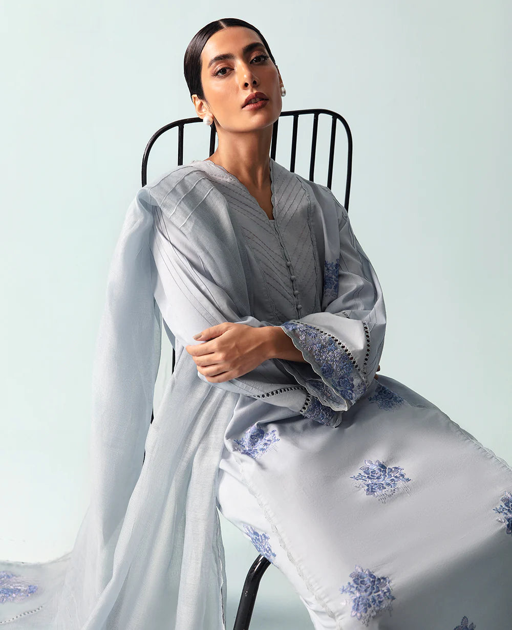 Picture-perfect floral bunches gracefully dance across the shirt, their lilac embroidery adding a whimsical touch. The neckline is a masterpiece of top stitches and delicate lace details, exuding an air of refined elegance. Prepare to be enchanted by the sleeves, adorned with embroidered floral organza borders, delicate insert lace, and meticulously crafted pintucks, creating an exquisite interplay of textures. The dupatta steals the spotlight with its four-sided floral bunches and meticulously placed pin-tucks on organza, completing the ensemble with an ethereal flourish. Elevate your style to new heights with this irresistible creation, where artistry meets everyday elegance.