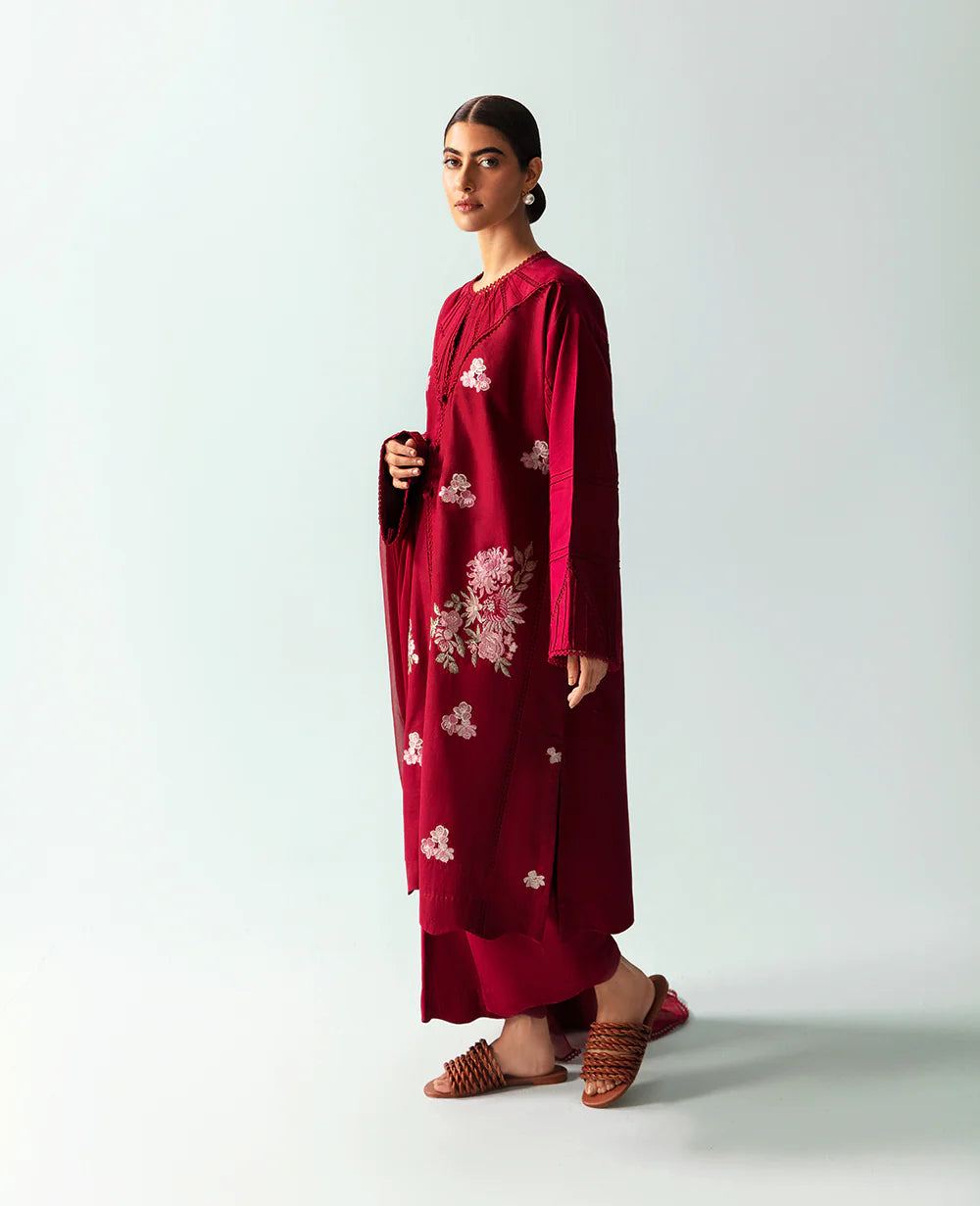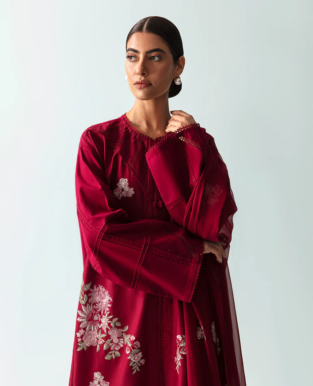 A beautiful three-piece plum ensemble adorned with delicate floral embroidery in mesmerizing hints of plum and ethereal greyish blue. The captivating neckline, tastefully crafted with insert lace and intricate scallop detail, adds a touch of timeless sophistication. Paired flawlessly with tonal trousers, also featuring the enchanting lace and scallop accents, this ensemble speaks volumes of refined style and pure grace. Step into the spotlight and make a lasting impression with this stunning outfit that seamlessly blends artistry and fashion.