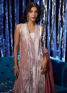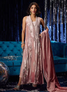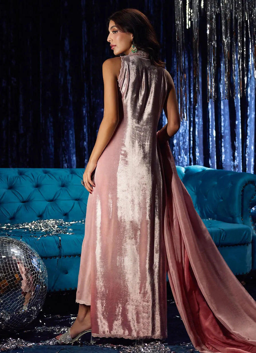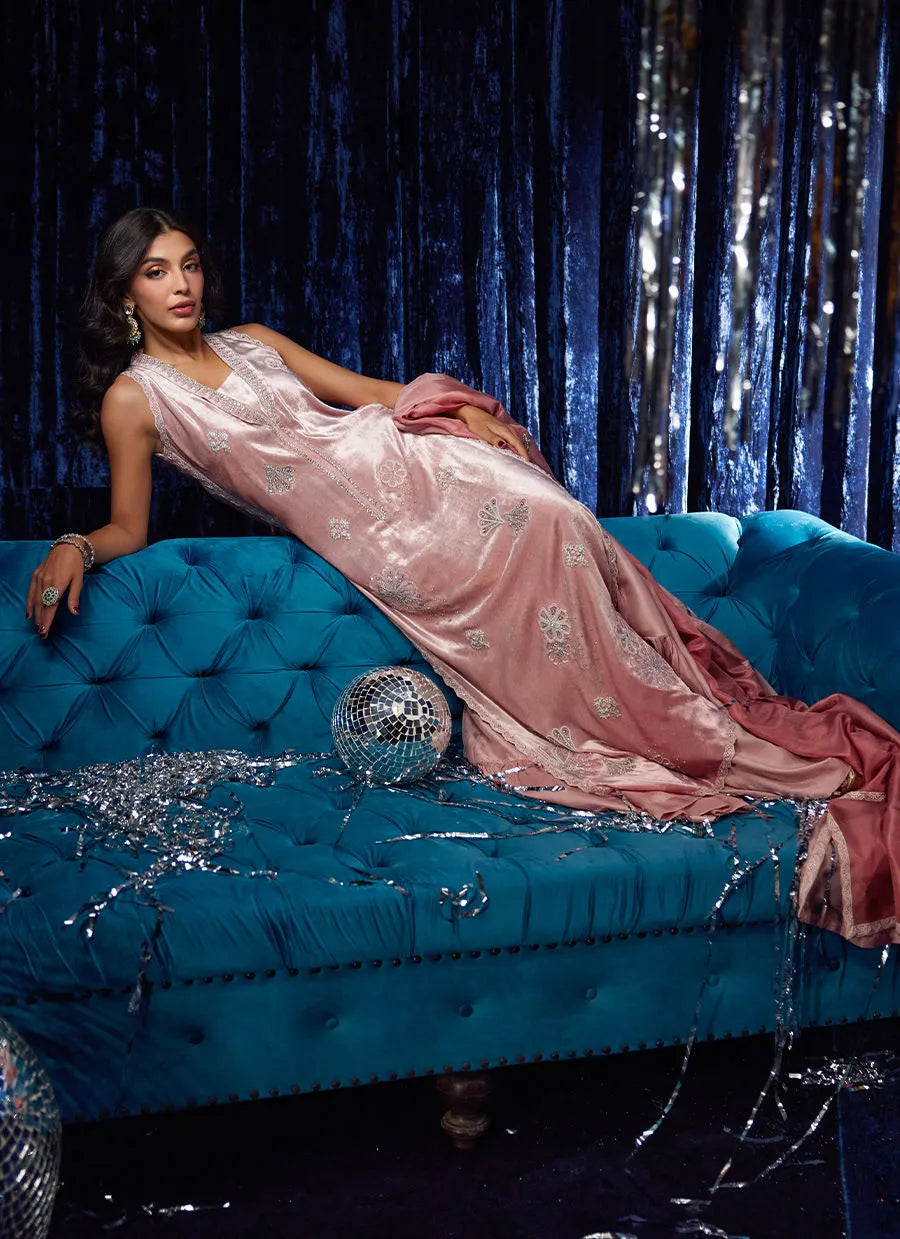 Romantic, radiant, and impossibly chic — this ombré pink velvet creation captures the essence of modern femininity. The straight long shirt, cut from plush velvet that transitions seamlessly from pale misty rose pink to delicate blush, is adorned with intricate appliqué embroidery and exquisite hand embellishments of kora, dabka, crystals, sequins, and pearls. The luminous craftsmanship adds depth and texture, catching the light with every movement. Paired with a tonal medium silk dupatta in dreamy pink hues and a pure raw silk izaar, this look is the epitome of festive refinement — timeless, feminine, and utterly captivating.