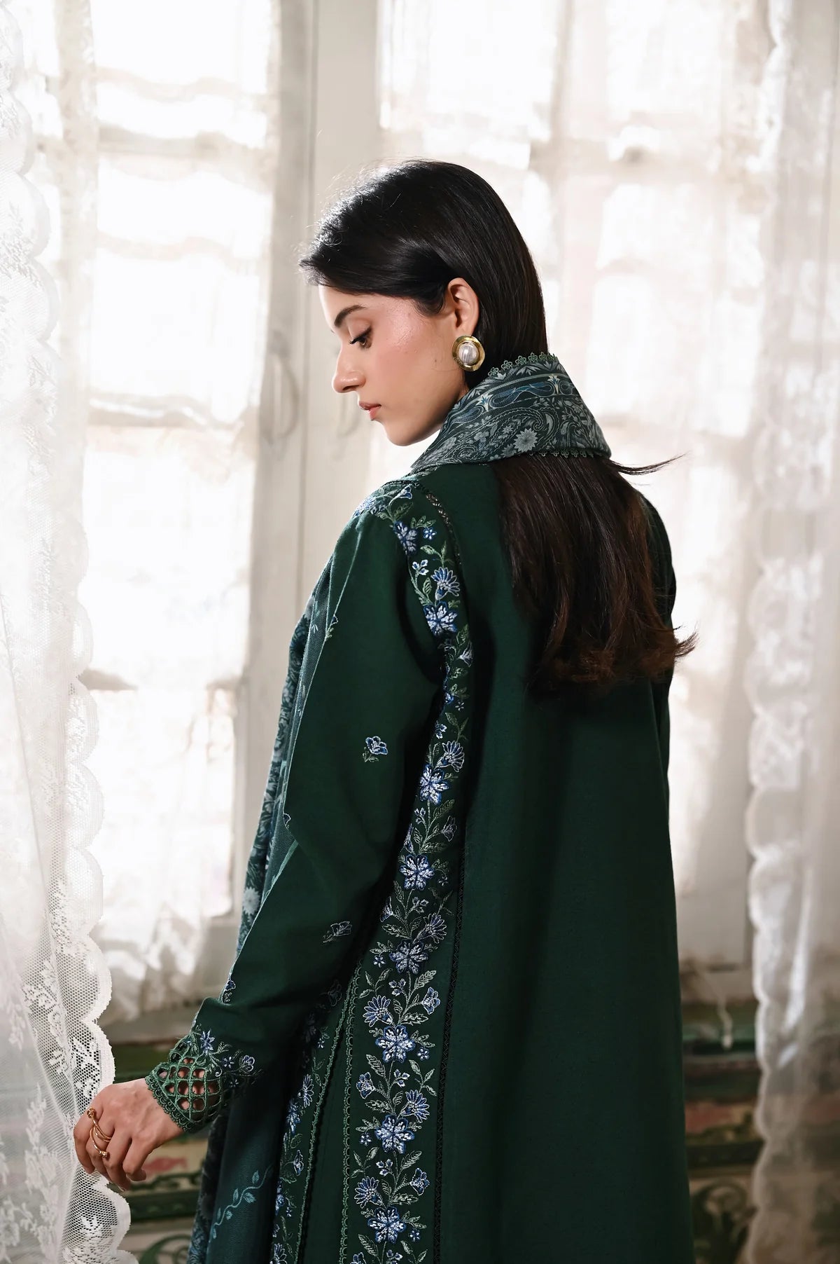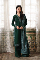 Indulge in the luxury of deep, sophisticated Deep Green with this stunning karandi three piece suit. This regal set features fine self-on-self embroidery along the borders and cuffs, creating a rich texture. The captivating element is the coordinating printed dupatta, which boasts a mesmerizing print or woven pattern in contrasting shades of blue and sage, adding depth and charm. Complete with elegantly tailored, embroidered trousers, this ensemble is the perfect pick for winter festivities and formal gatherings.