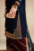 This luxurious formal ensemble features an intricately embroidered pure velvet front, sleeves, and borders on the front, back, and sleeves, creating a rich, elegant texture. The dyed pure velvet back complements the detailed bottom embroidery, enhancing the garment's sophistication. Completed with an embroidered georgette chiffon dupatta adorned with velvet borders, this outfit balances opulence and delicate craftsmanship for a distinguished formal look.