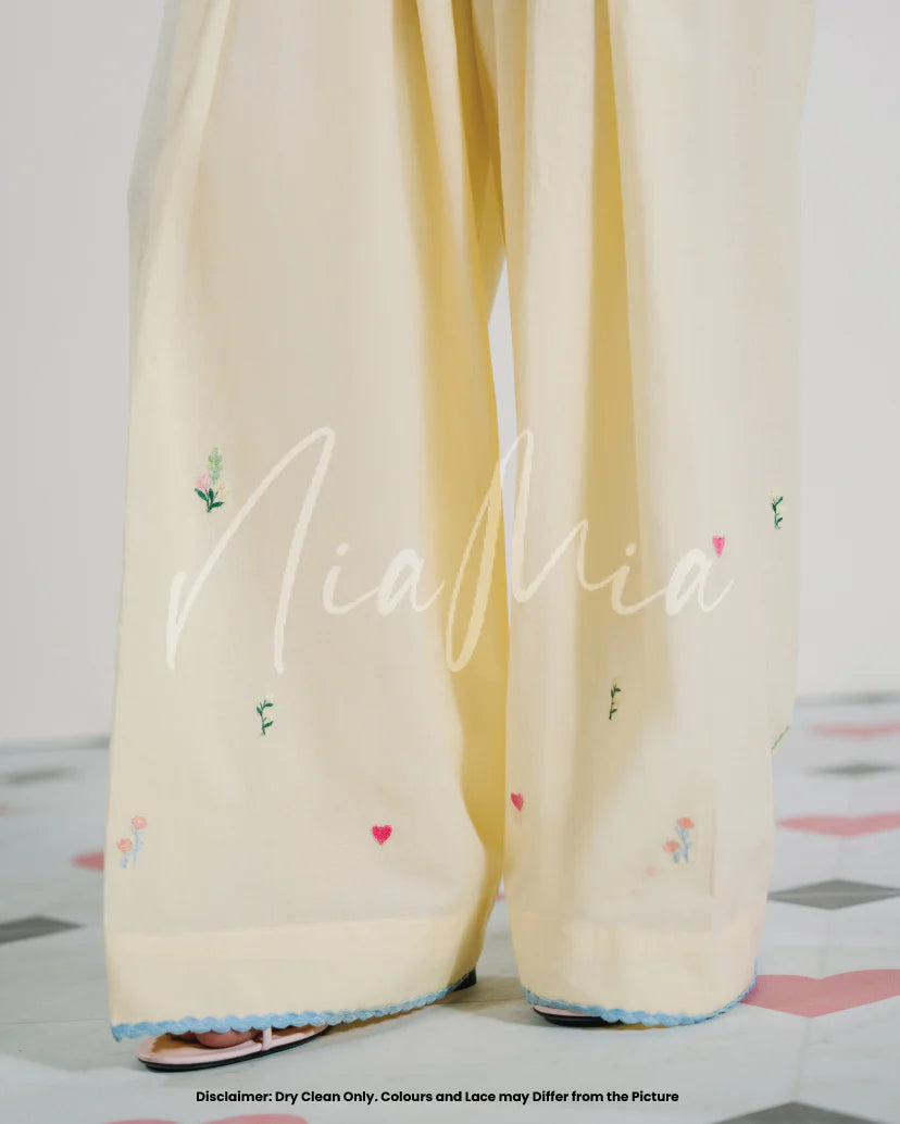 A two-piece lawn ensemble in soft butter yellow, adorned with pastel floral embroidery and tiny heart details. The shirt features a straight, easy silhouette with embroidered borders and light blue edging, paired with a farshi shalwar for a breezy daytime look that feels effortlessly fresh.