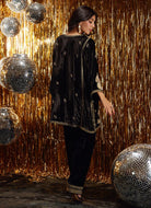 A classic black velvet shirt richly embroidered with subtly shimmering gold dabka work embellished with Swarovski crystals, offset with silk threadwork in pink and green. Complete your outfit with our velvet shalwar (as shown) to feel instantly dressed up. Styled with high heels, gold jewels and high pony tail you have an eternally stylish look!!