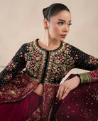 A symphony of bold elegance and timeless craft this organza paneled masterpiece enchants with its striking contrasts. The structured black bodice blooms with vibrant, hand embroidered florals melting seamlessly into rich red organza panels adorned with silver motifs and sequins that glimmer like stardust. Lush green and hot pink borders frame the design with playful sophistication, while the organza dupatta softly shimmering with scattered sequins adds a veil of mystery. Finished with a black embroidered border, it becomes a portrait of refinement, artistry and allure. A true celebration of modern glamour rooted in heritage.