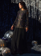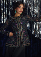 Striking and contemporary, this black organza jacket is a vision of modern elegance. Intricately hand-embellished with colored crystals and naqshi, it exudes a subtle radiance with every movement. The short, front-open silhouette is edged with a plush velvet appliqué, exquisitely adorned with resham and naqshi detailing — a true testament to artisanal craftsmanship. Paired with a sleek raw silk bustier and a fluid black crepe silk skirt, this ensemble seamlessly balances structure and softness, making it the ultimate statement of refined glamour.