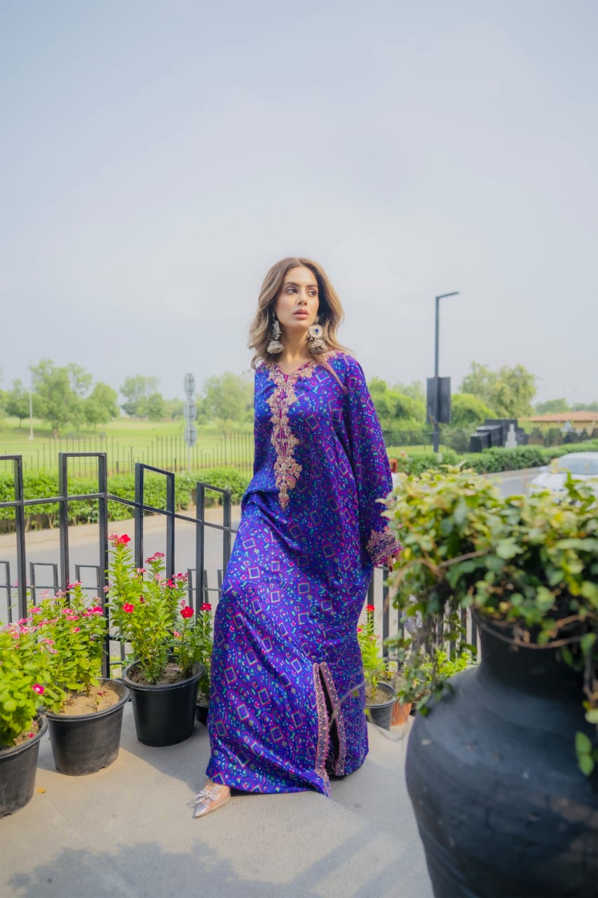 Designed in a flowing silhouette with a detailed neckline and embellished cuffs, this kaftan combines effortless comfort with striking elegance. Its vibrant hues and handcrafted detailing make it a timeless piece you’ll treasure season after season.