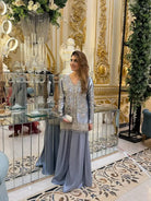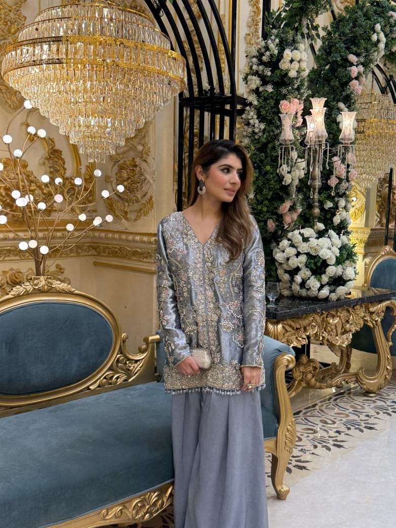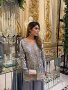 An ethereal ensemble crafted in a dreamy shade of silver-grey, this outfit features a short jacket-style shirt beautifully adorned with intricate embellishments. The pure lama tissue shirt is delicately finished with hanging drops along the ghera, adding a graceful charm to the design. Paired with pure raw silk 80 gram box-pleated pants, the look balances structure with flow, making it a timeless choice for formal occasions.