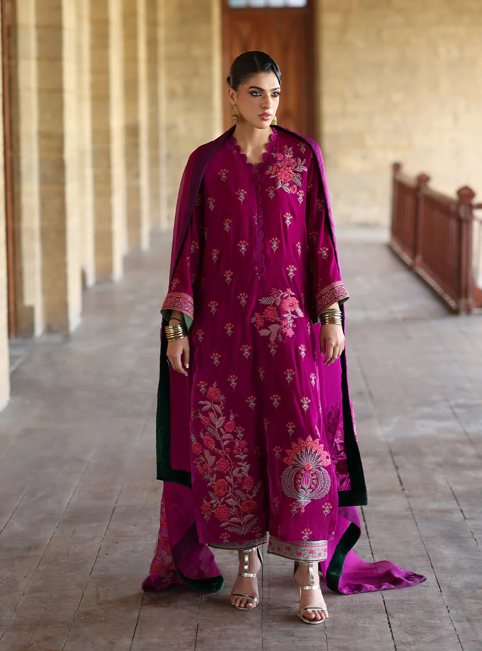 The matching velvet trousers create a timeless monochrome look, ensuring a polished and regal presence. it is a breathtaking statement piece, perfect for formal winter dinners, intimate mehndi, or high-end evening gatherings.