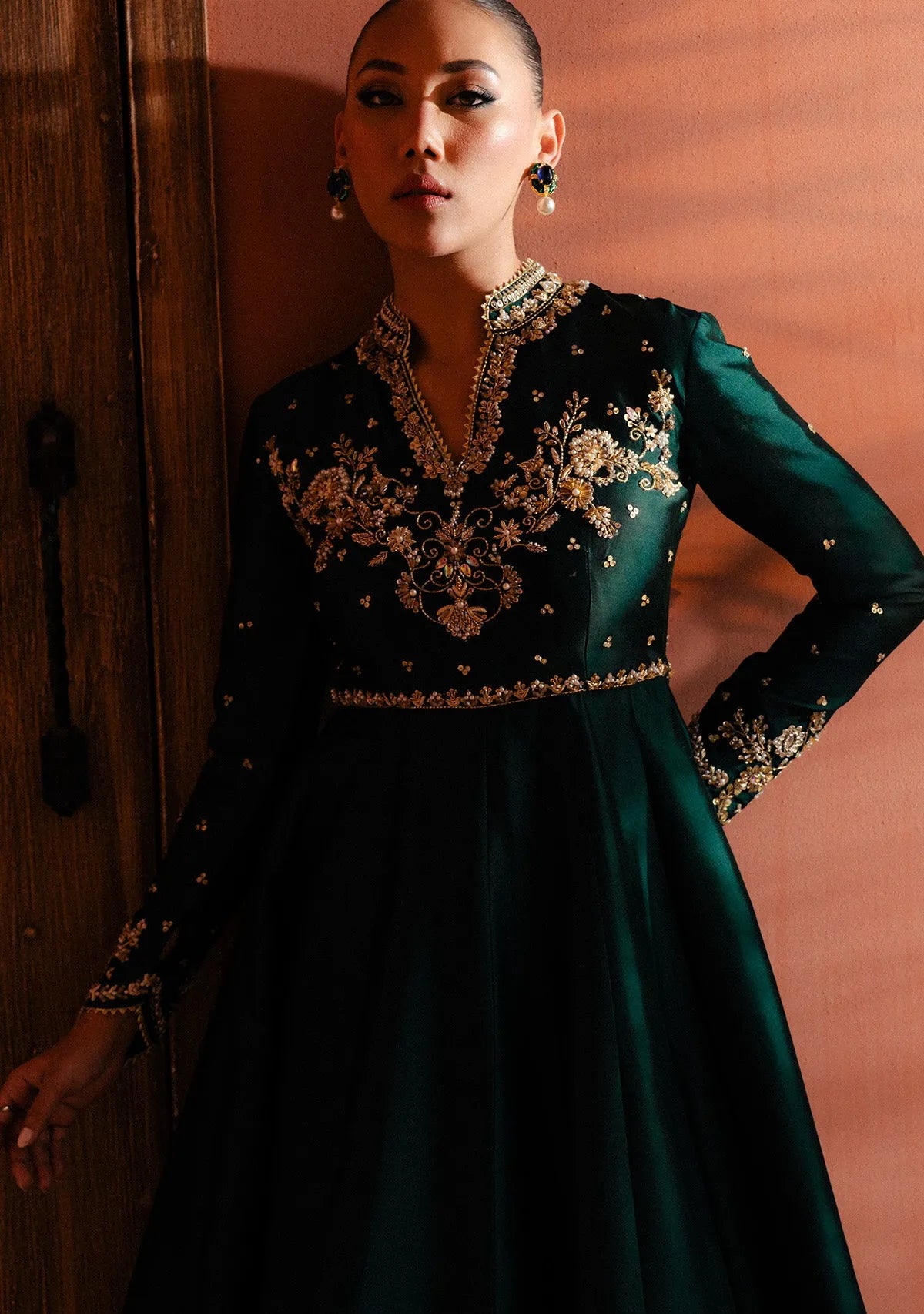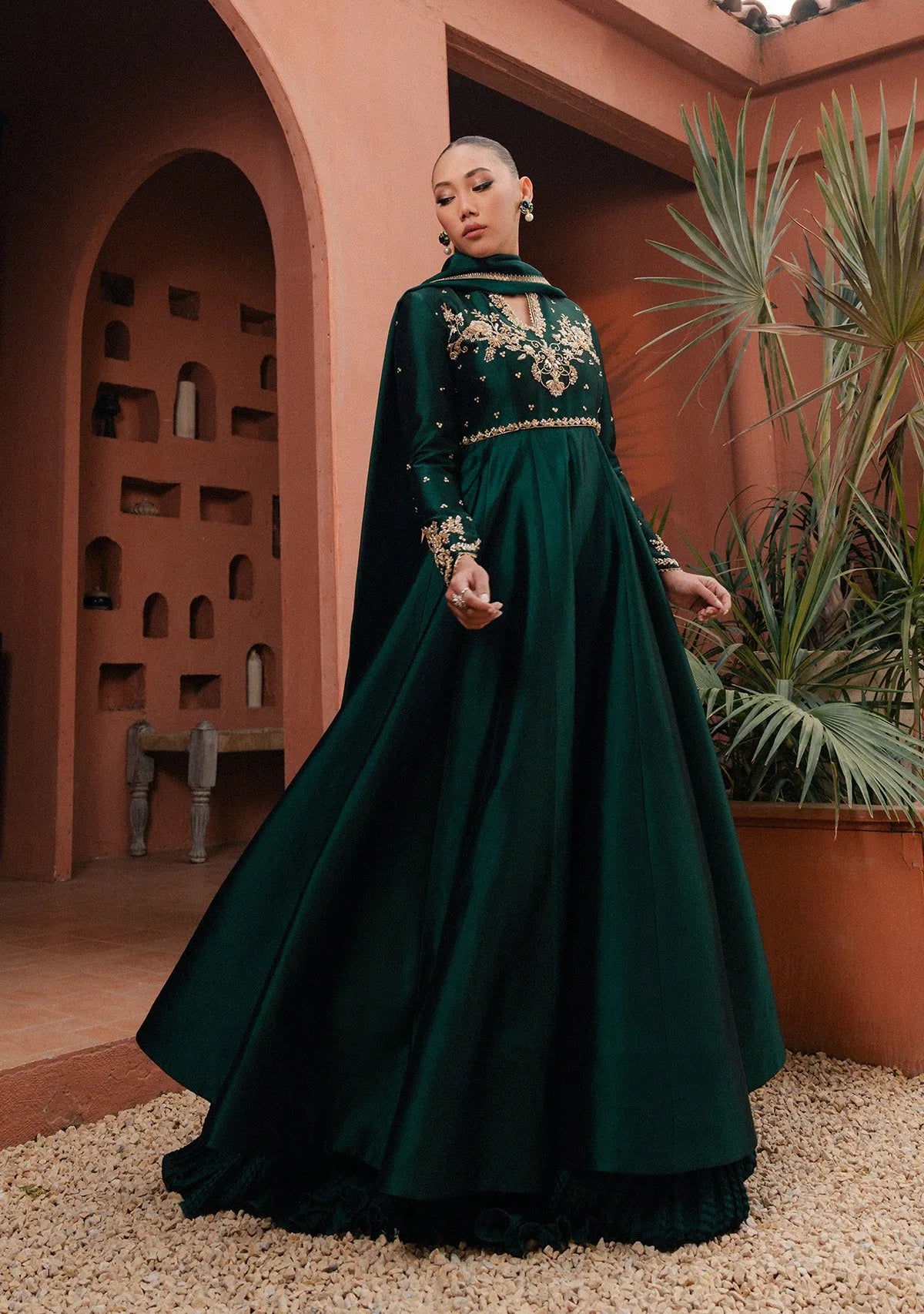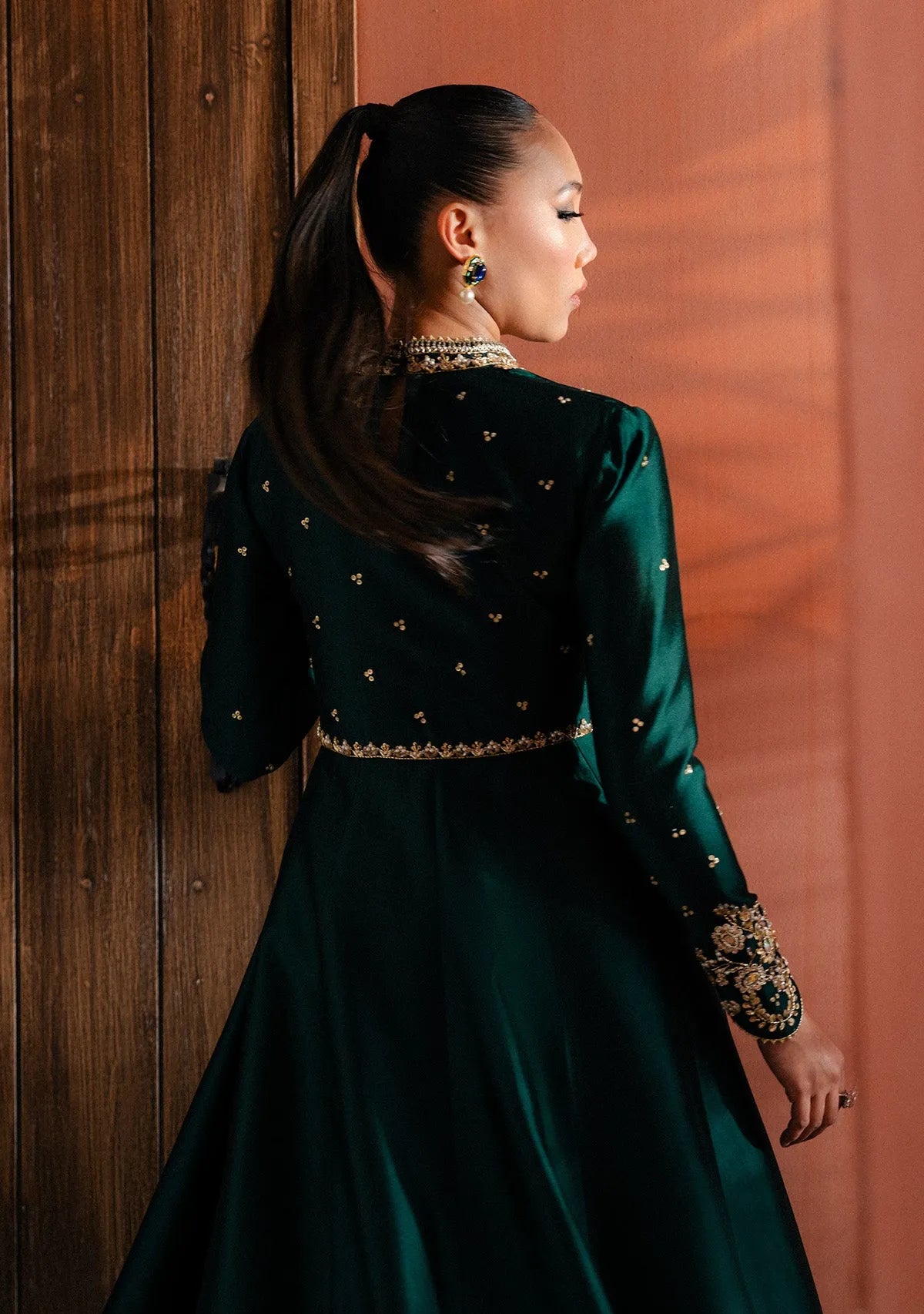 Dinah, the deep emerald sheesha silk peshwas comes with a delicately hand-worked bodice and sleeves with silk panels, a crushed silk lehnga and a gold detailed silk dupatta.