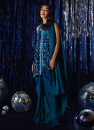 An effortlessly elegant statement — this Prussian blue and sea green velvet jacket is adorned with intricate resham and zardozi handwork, creating a captivating interplay of colour and craftsmanship. The jacket’s rich tones transition beautifully into the fluid grace of a dip-dyed charmeuse silk sari skirt, adding a modern twist to a timeless silhouette. Perfect for evening soirées and festive occasions, this ensemble strikes the perfect balance between sophistication and glamour.