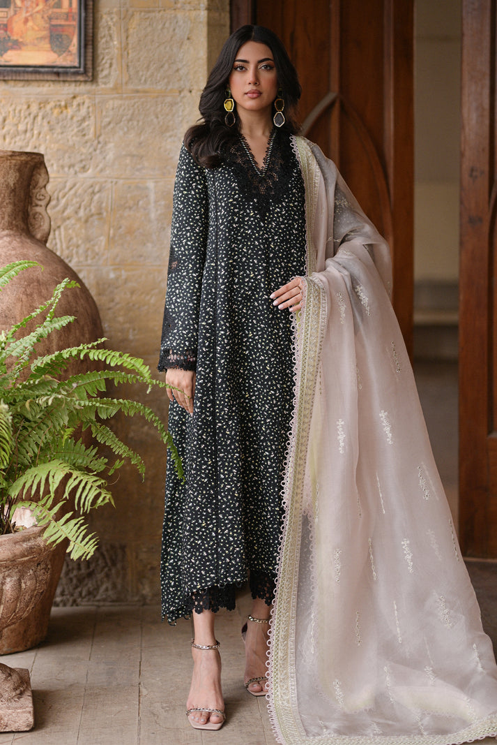 The black floral printed drop corner shirt has stunning cutwork embroidery that adds a touch of elegance. It pairs perfectly with the pants, creating a stylish and sophisticated look. And the powder pink embroidered dupatta adds a soft and feminine touch. It’s a beautiful ensemble that’s sure to turn heads.