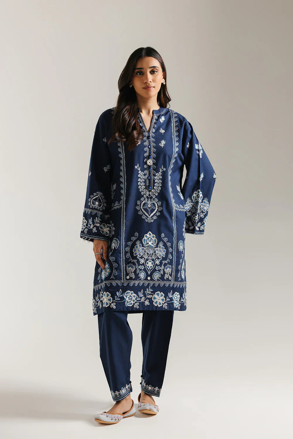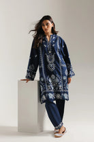 Dive into the rich heritage of craftsmanship with this stunning indigo blue embroidered suit. The straight-cut kurta is a masterpiece of intricate artistry, featuring dense traditional embroidery in contrasting white and light blue threads that covers the entire front, sleeves, and neckline. The embroidery forms beautiful floral, stylized geometric, and paisley patterns, creating a mesmerizing visual flow. The ensemble is perfectly completed by comfortable, solid indigo shalwar that feature matching detailed embroidery at the hem, resulting in an elegant and deeply traditional outfit.