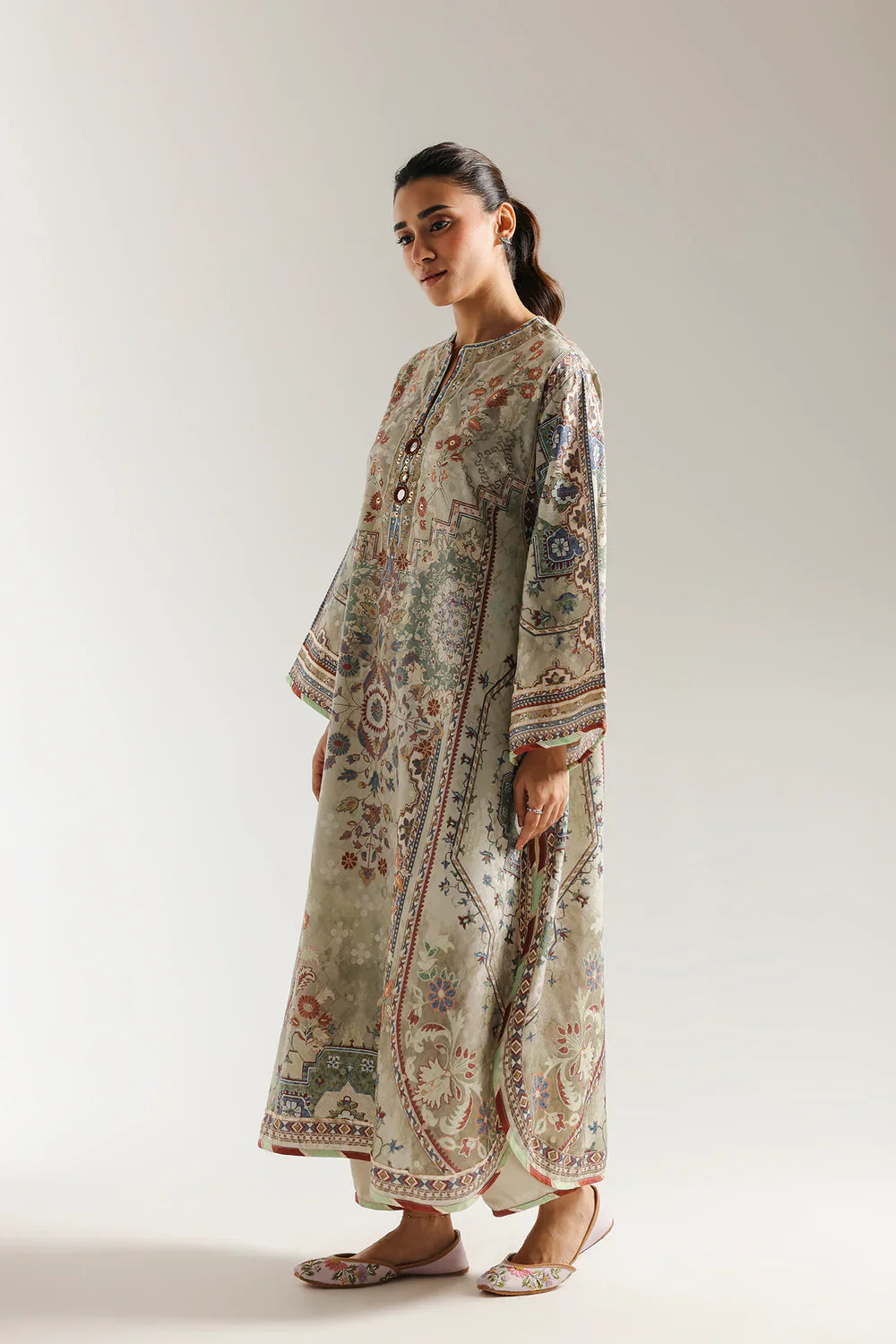 This stunning printed suit is a true work of art, reminiscent of exquisite tapestries. The long kurta is adorned with an all-over intricate print, featuring a rich palette of muted greens, blues, and reds in traditional floral and geometric patterns. Paired with coordinating trousers, this ensemble creates a captivating and timeless look.