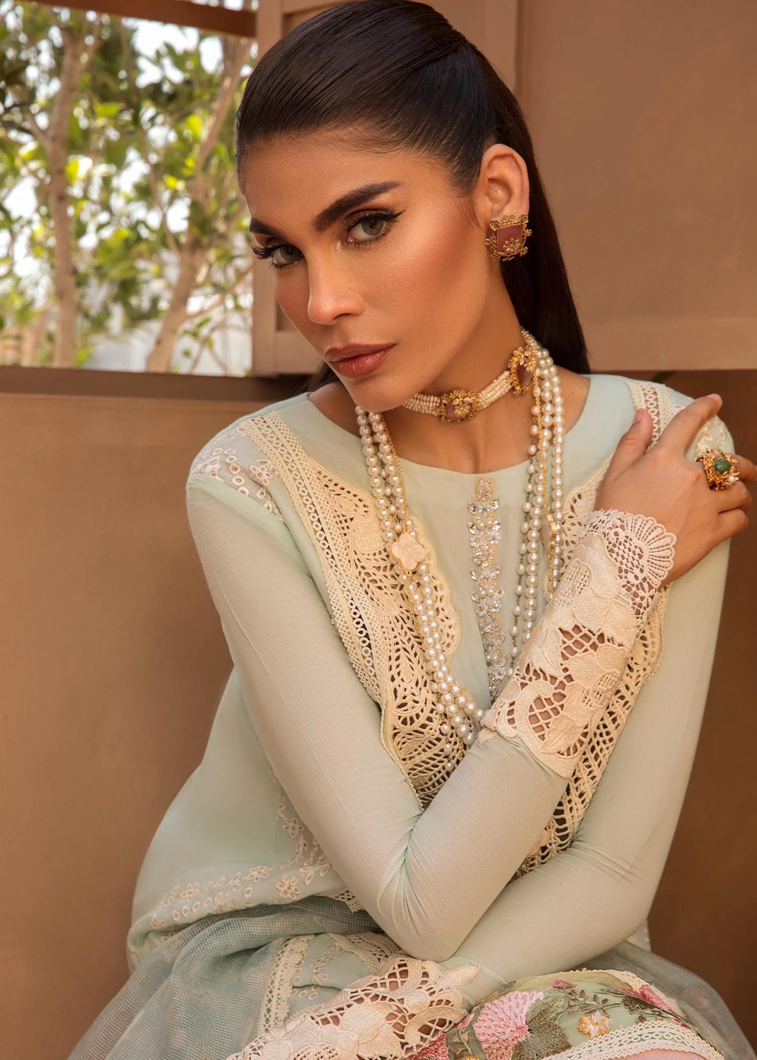 Description: Cerulean Mint, with its lawn shirt, khaddi net duppata, and cambric pants, exudes elegance. The ensemble features exquisite cutwork, a sparkling crystal placket, and a mesmerizing dimonties spray, capturing enchantment effortlessly.