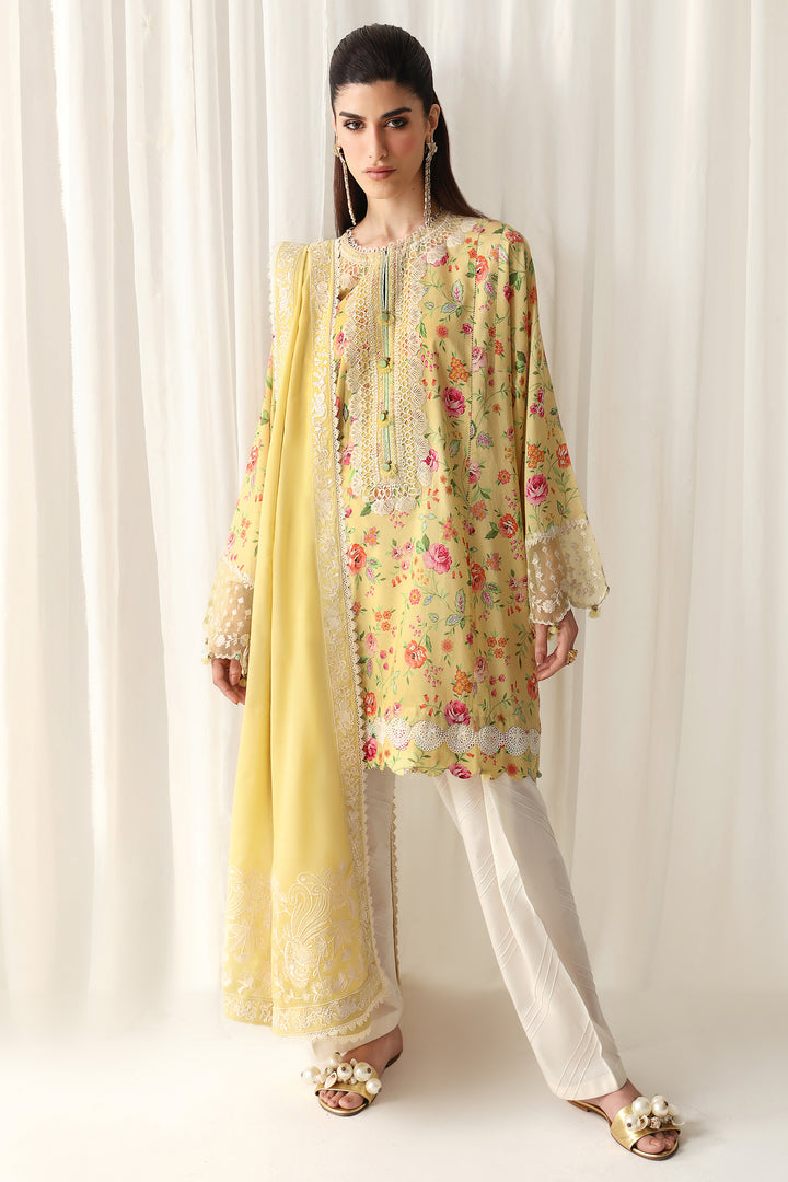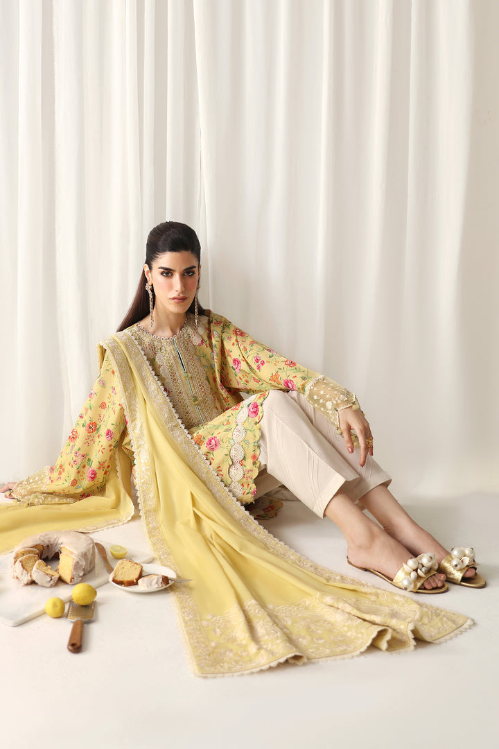 Introducing "๐๐๐ง๐๐ฃ๐๐,"- a breathtaking ensemble that captures the essence of a sun-kissed garden in full bloom. Set against a Laguna yellow backdrop, dainty florals painted in shades of pink, rouge, tangerine, and yellow, with hints of azure and green, evoke the whimsy of a summer garden. Intricate lace details add an air of sophistication, while a delicate organza border adorned with intricate embroidery lends an ethereal touch. Paired with a tonal dupatta featuring an embroidered festoon of ivory flora, "Serenia" is the epitome of garden affair elegance, promising to enchantย atย everyย turn.ย ย ย ย