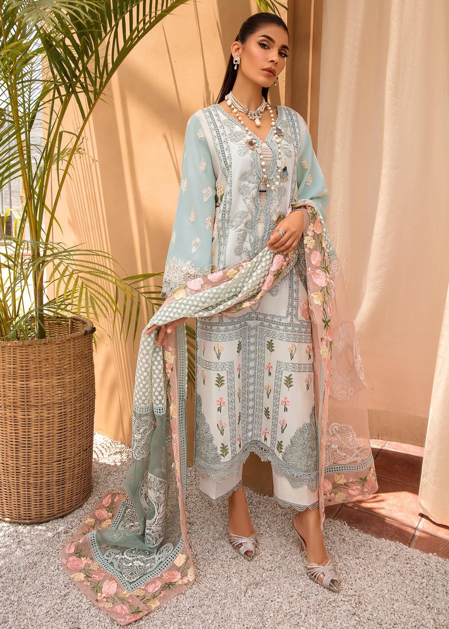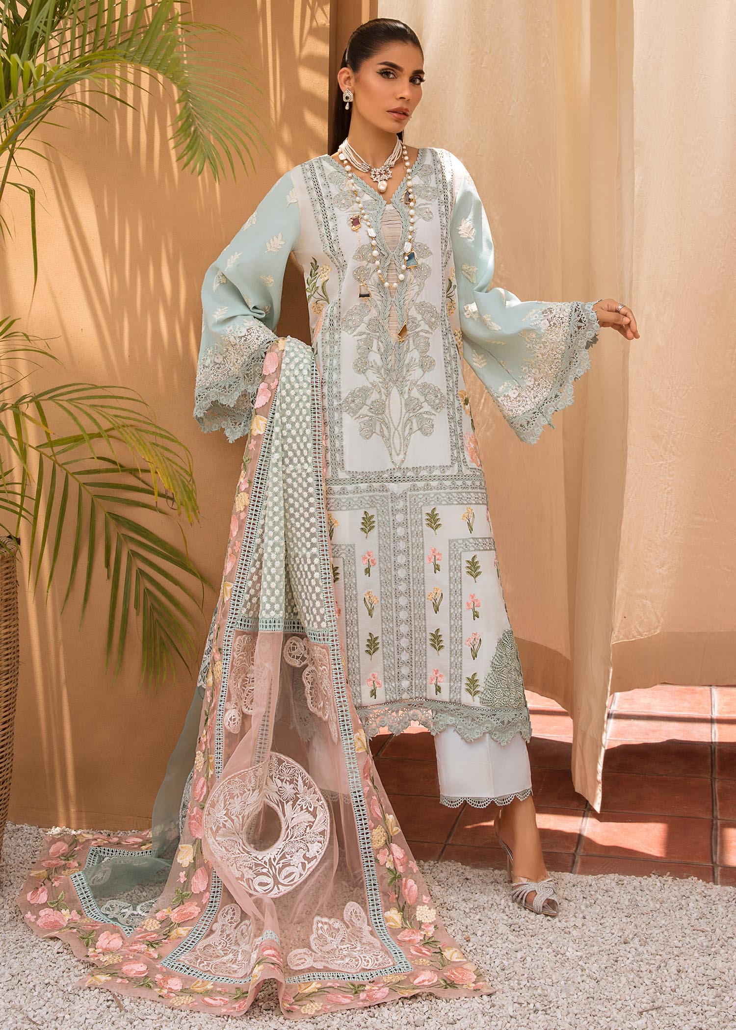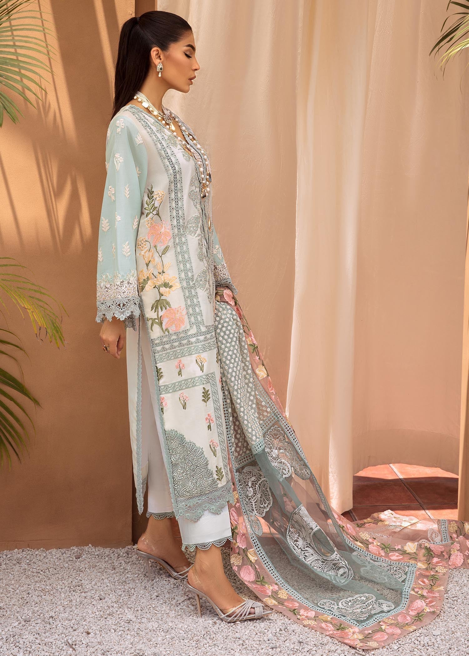 Snowflake, a mesmerizing fusion of white and blue, showcases a lawn shirt, khaddi net duppata, and cambric pants. Adorned with exquisite cutwork, crystal accents, and a stunning dimonties spray.