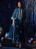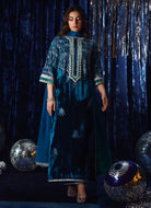 A captivating deep teal velvet shirt adorned with intricate OG motifs, plush velvet appliqué, and exquisite Swarovski detailing featuring kora, dabka, sequins, and crystals along the neckline and side slits. The ensemble is paired with a pure raw silk izaar edged with zari, and a pure medium silk dupatta— a look that perfectly balances timeless opulence with modern grace.