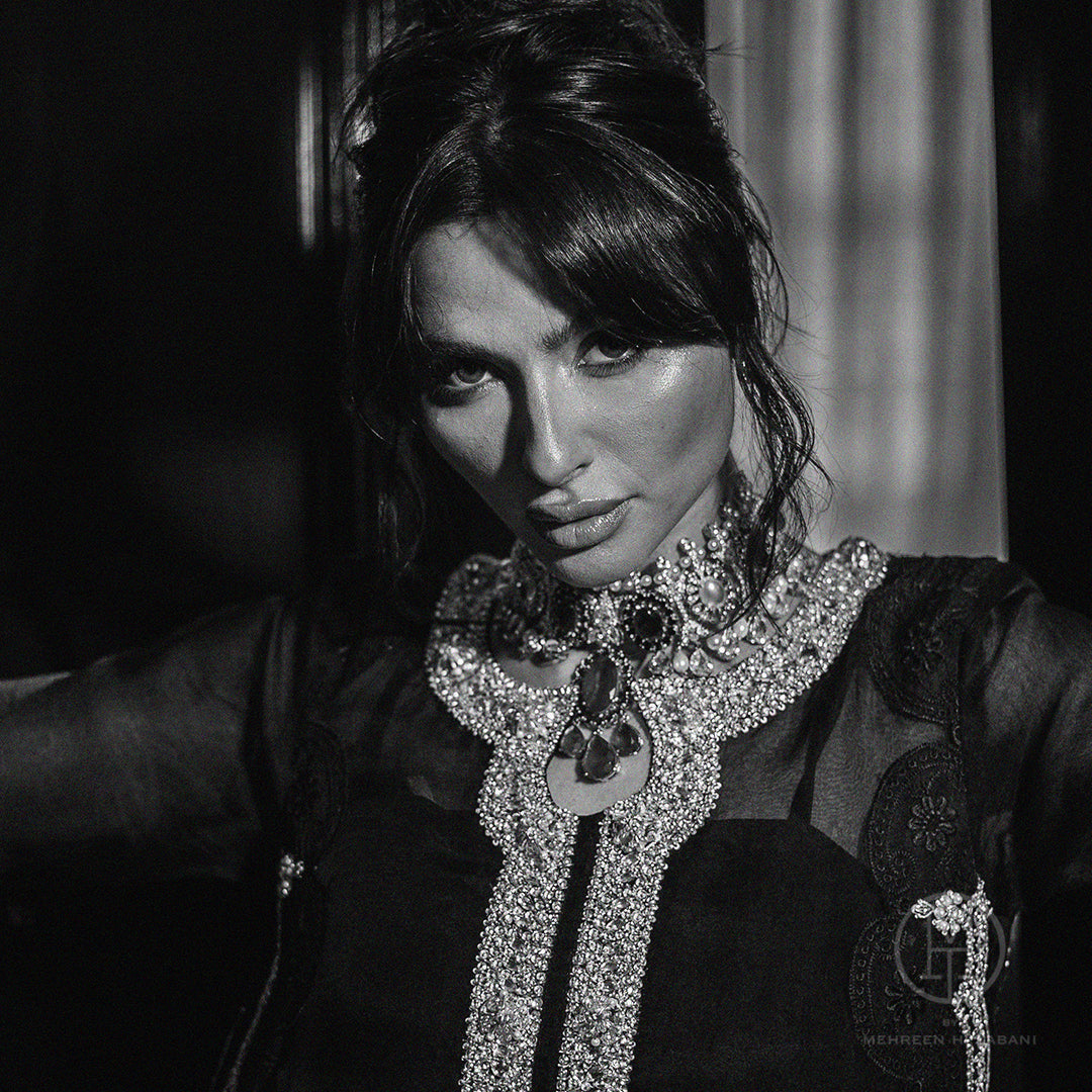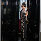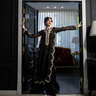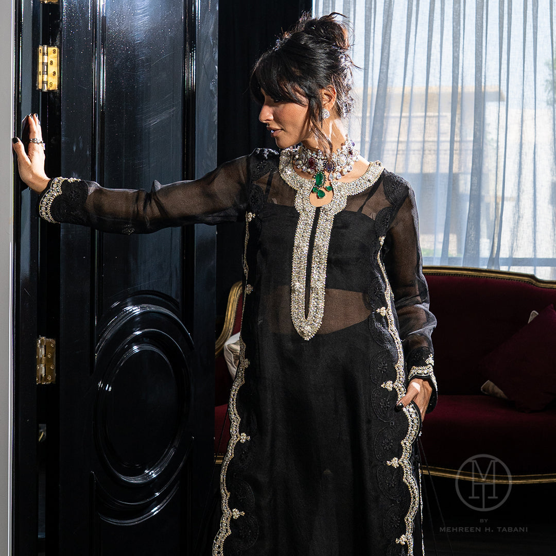 Black, layered, and finely finished, Moonlit Mirage is made for the kind of evenings that stay with you. The sheer-sleeved shirt is cut in a fluid silhouette, stitched with silver and dull gold embroidery that runs across the neckline and hem like a quiet shimmer.