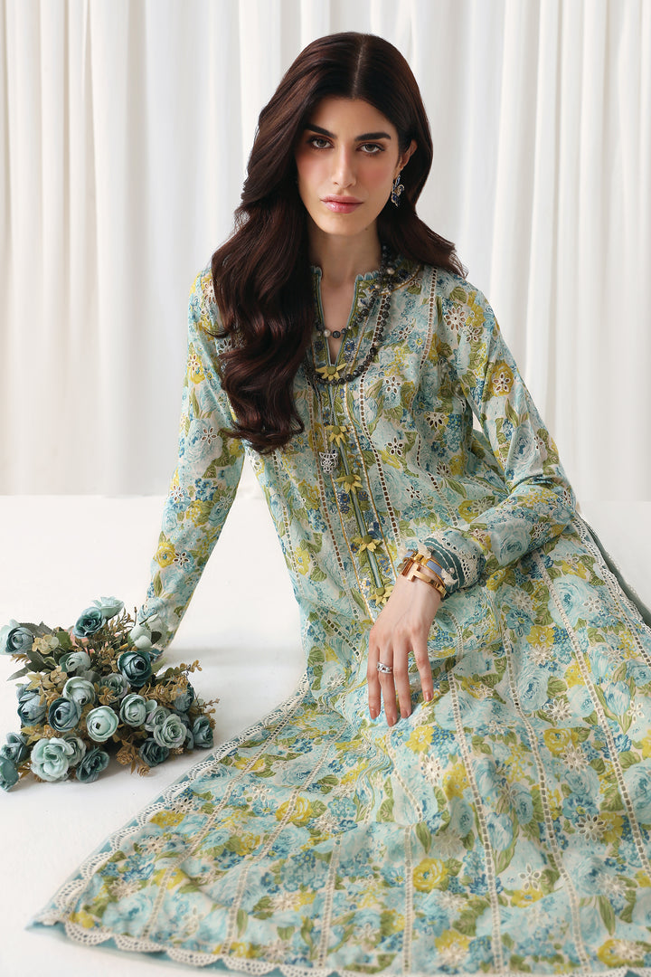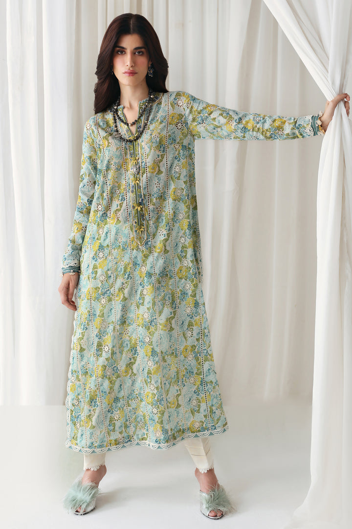 Introducing "πππ§ππͺπ§π"- a masterpiece of botanical bliss that captures the essence of a sun-kissed garden in full bloom. Picture florals painted in hues of aqua, azure, and lime, their delicate petals dancing amidst lush green folioles. The shirt is adorned with stripes of broderie anglaise, meticulously crafted from top to hem, each stitch a testament to artisanal dedication. Delicate florals, expertly rendered in schiffli, add a whimsical charm to the ensemble. Detailed laces adorn the sleeves and hem, their intricate patterns adding an air of ethereal beauty. Completing the look, a tonal trouser with love details adds a playful touch, ensuring that "Verdura" is a symphony of style and sophistication that will leave onlookers spellbound.