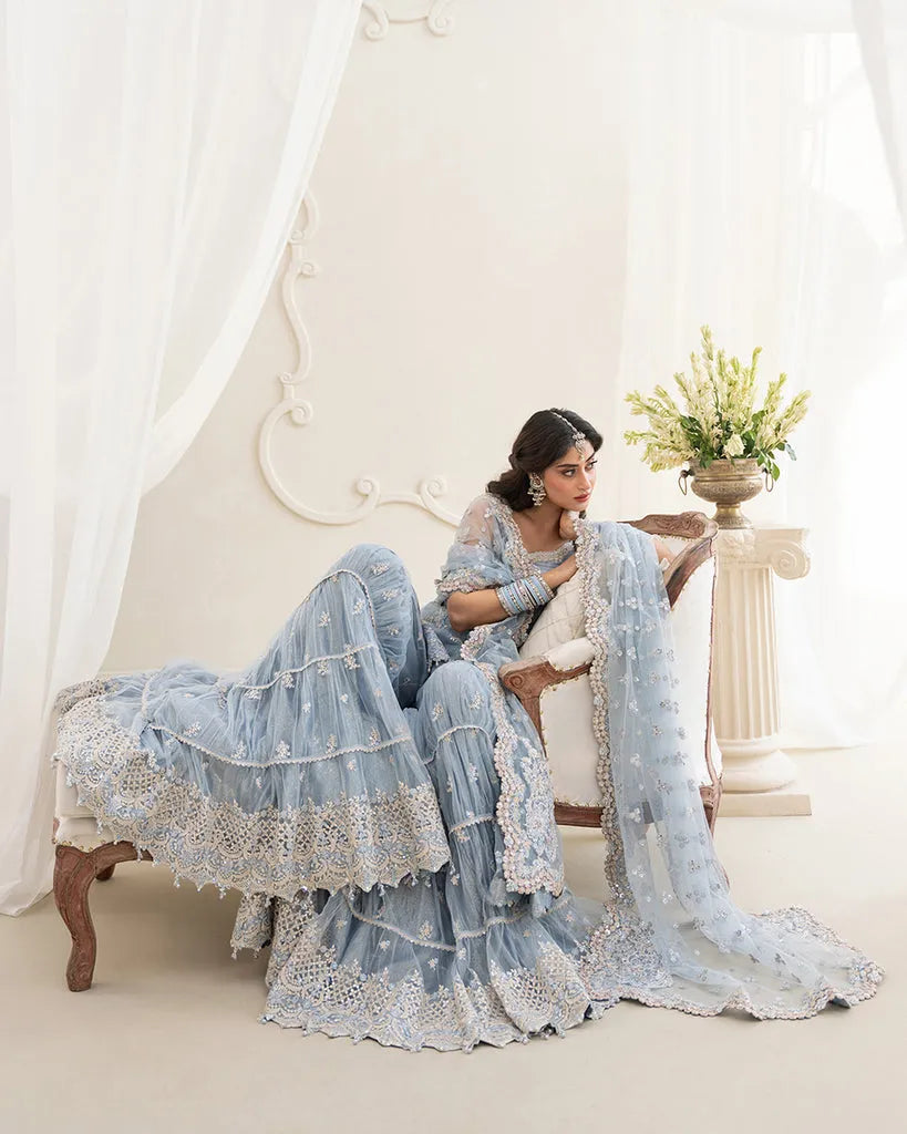 Channeling effortless refinement, Oya is a poetic balance of fluid drape and structured tailoring. Rendered on an ice blue net, the shirt comes intricately embroidered. This set is paired with an embroidered net gharara and an embroidered net dupatta, evoking serene movement. The interplay of sheer fabrics and a striking silhouette lend an air of contemporary sophistication, putting you in the spotlight at every occasion.