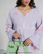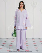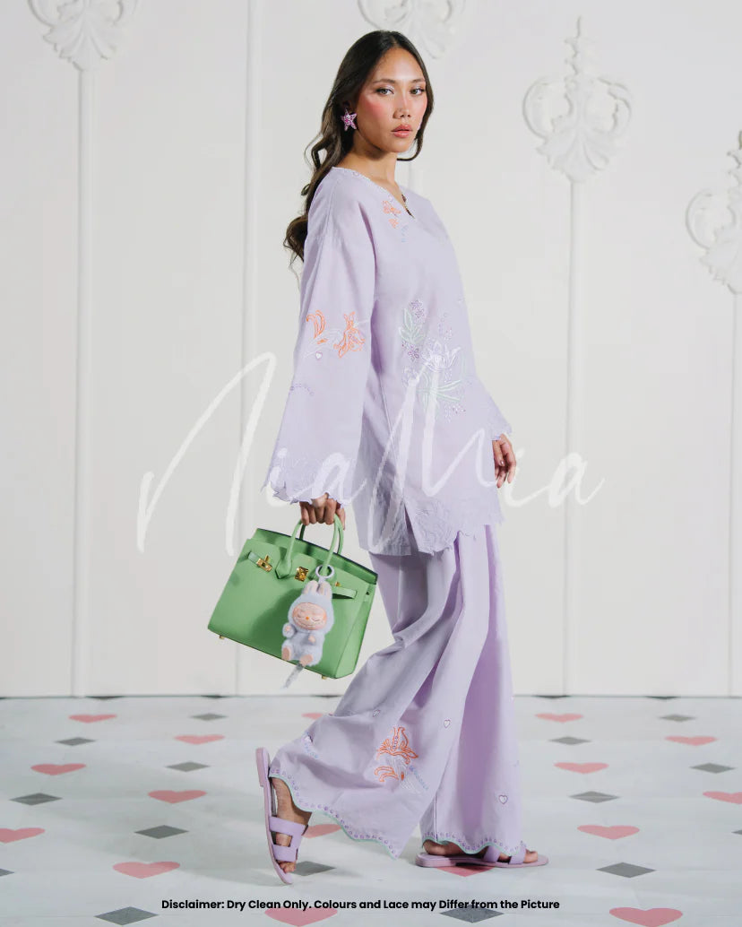 A soft lilac cotton lawn co-ord set featuring intricate pastel embroidery in shades of mint, coral, and white. The kurta is finished with delicate scalloped edges on the sleeves and hem.