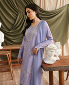 Enveloped in a gentle lilac, this outfit captures timeless elegance. The shirt, featuring drop corners, is beautifully embroidered in white on a lavender print. Its neckline is accentuated by crisscross topstitching, complemented by scalloped sleeves and delicate lace trim along the neckline and hem. Organza detailing on the sleeves adds an enchanting touch. Paired with shalwar, the ensemble is completed by a dupatta that boasts exquisite embroidery with L-shaped corners, infusing the look with a refined grace.