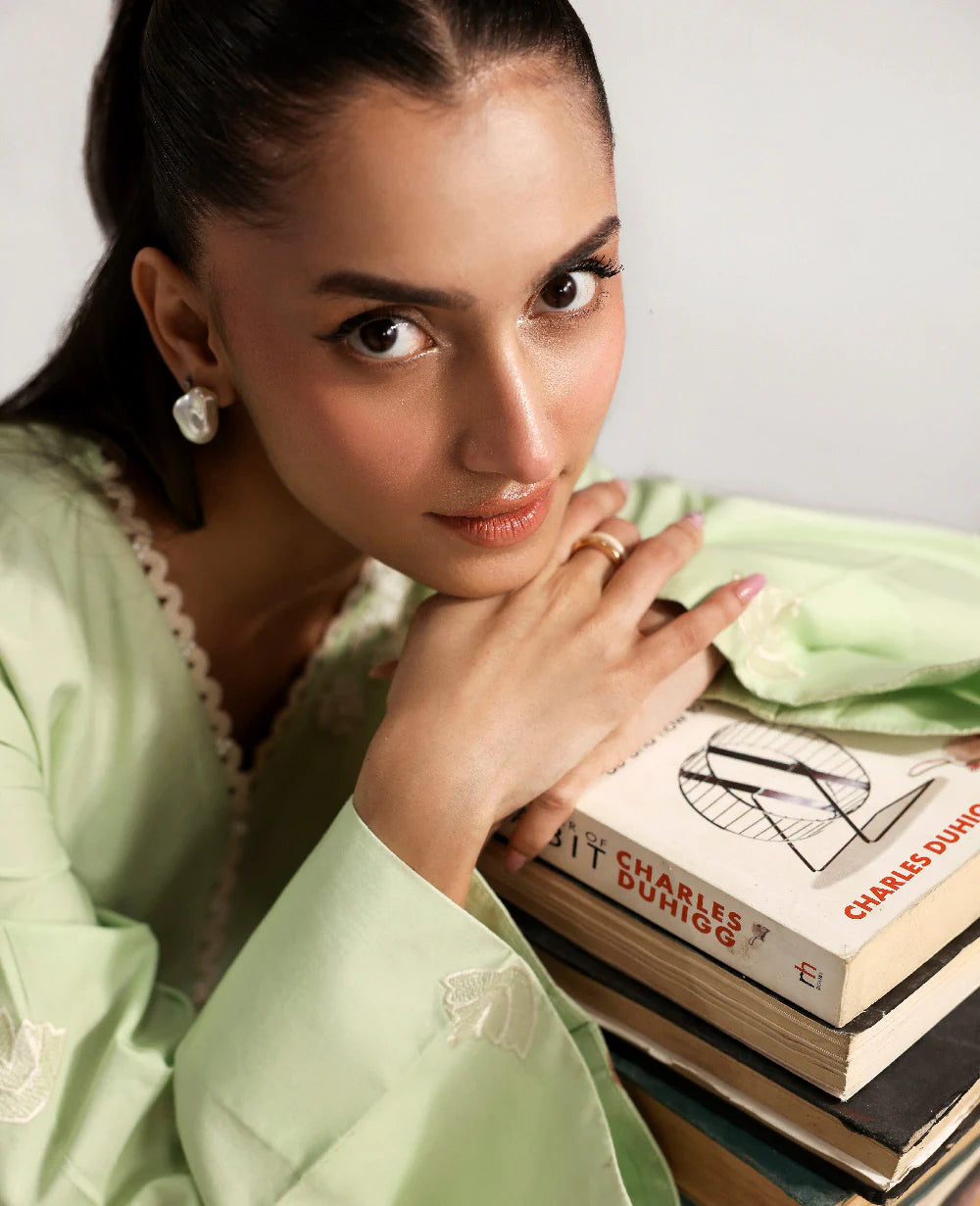 A pastel green cambric shirt adorned with intricate cutwork embroidery on the corners, offering a refined finish. The neckline is beautifully embellished with 3D floral appliqués, adding a touch of elegance and depth to this graceful design.