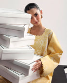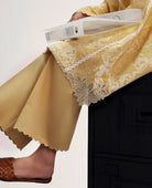 Practical yet cheerful design evokes feminine grace through an intricate repetition of ornate tiles in luminous golden tones, this profound marigold boxy cropped kurta with plain pants yielding a sophisticated synthesis of timeless refinement and modern elegance.