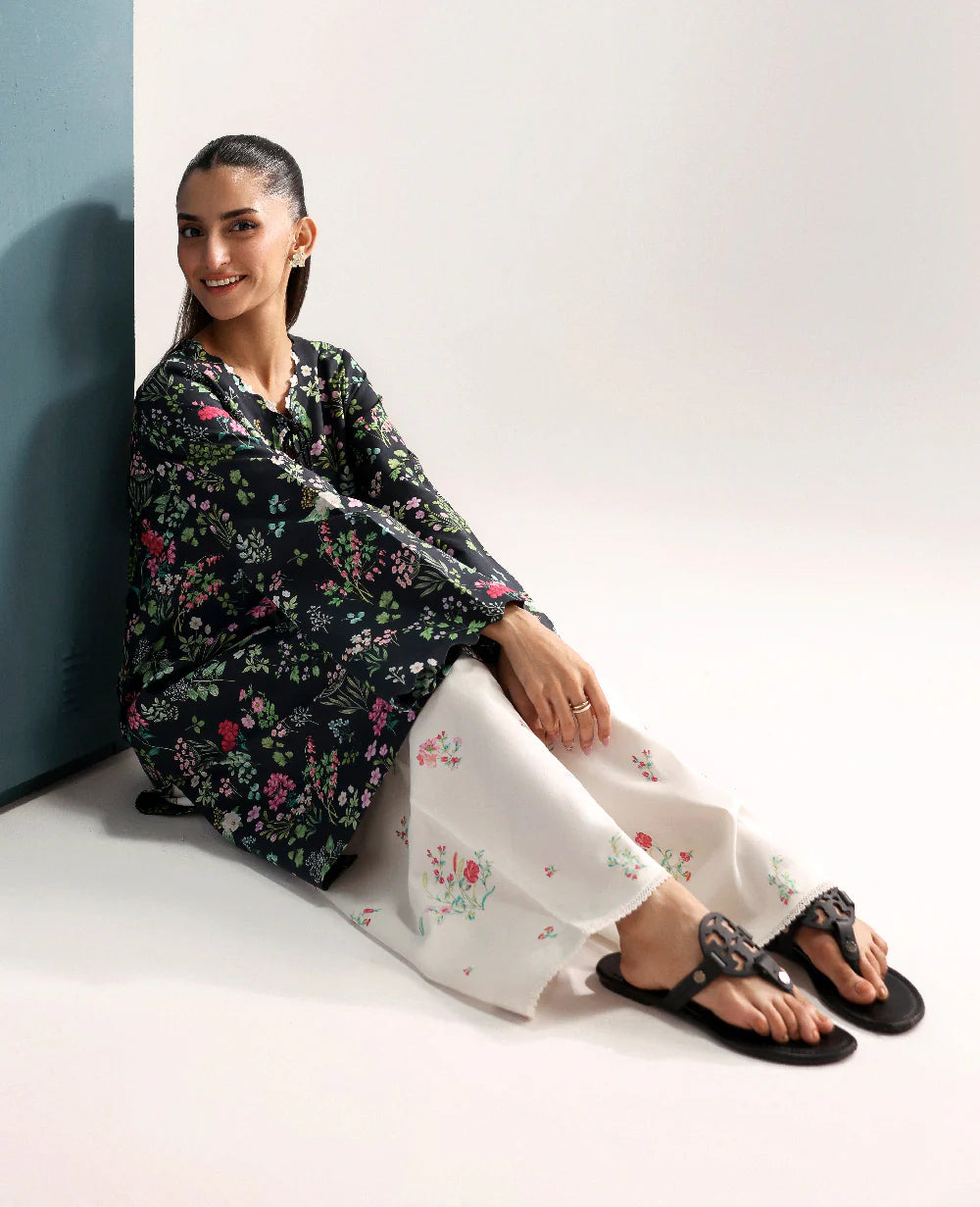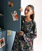 The opulence of black base design highlights radiant bouquets of pink white and green blooms entwined with lush foliage elegantly set against a contrast white lower to create a bold captivating and vibrant aesthetic.