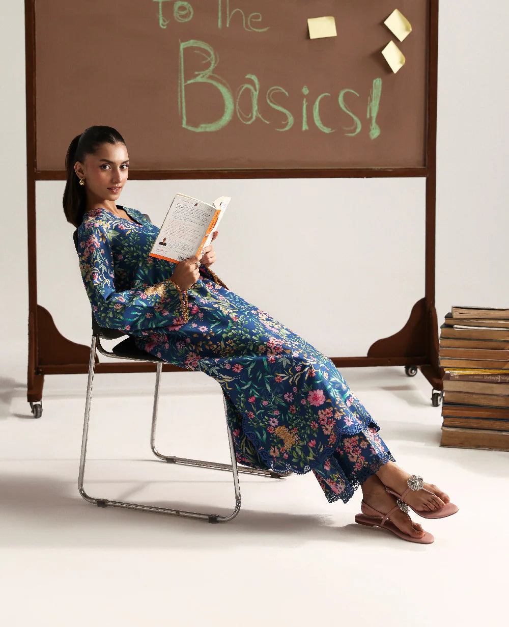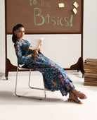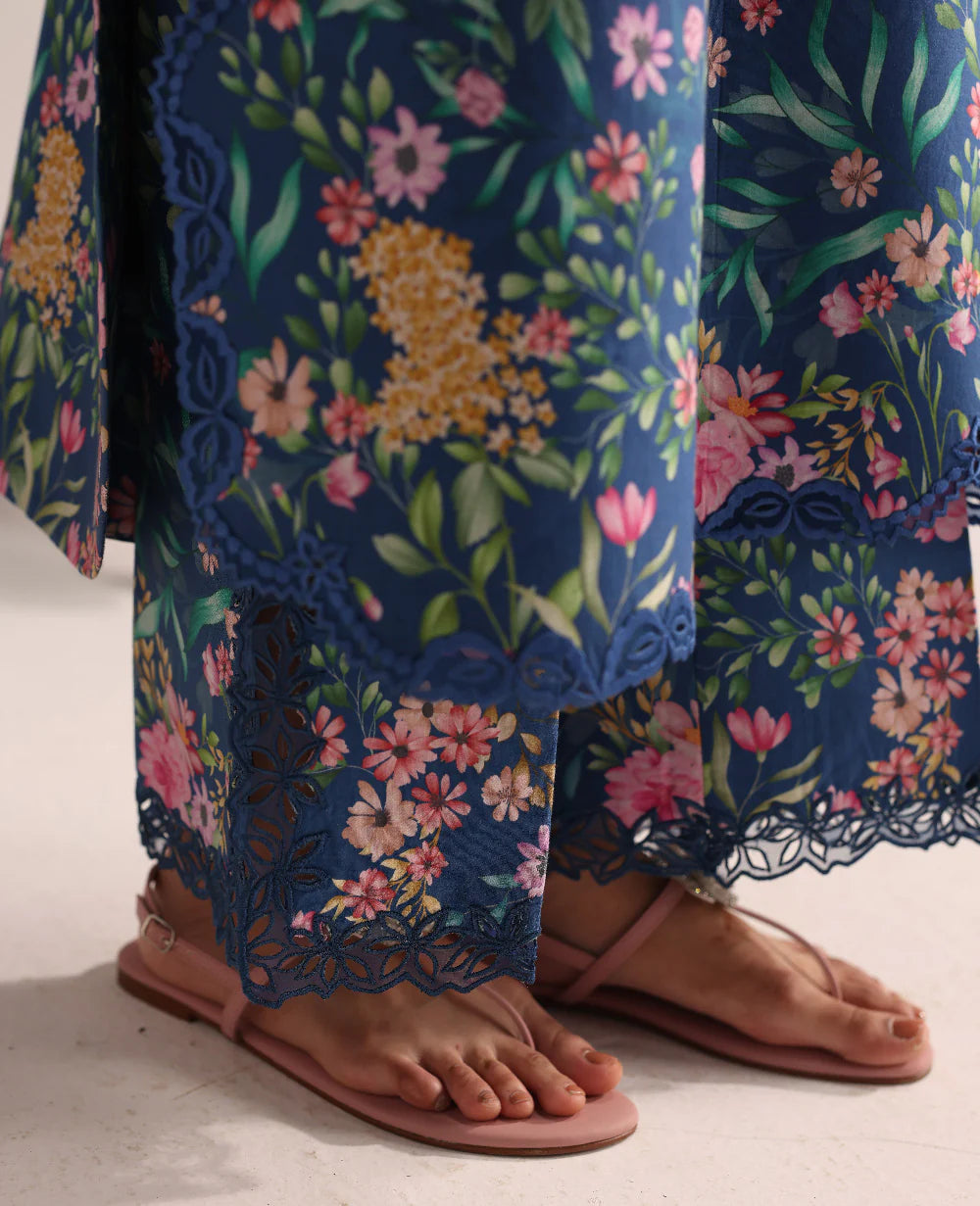 This cheerful Aline shirt in rich floral composition of vibrant florals and green foliage set against a deep navy background featuring lace edged sleeves and a scalloped hem styles with straight trouser for a feminine and contemporary appeal.