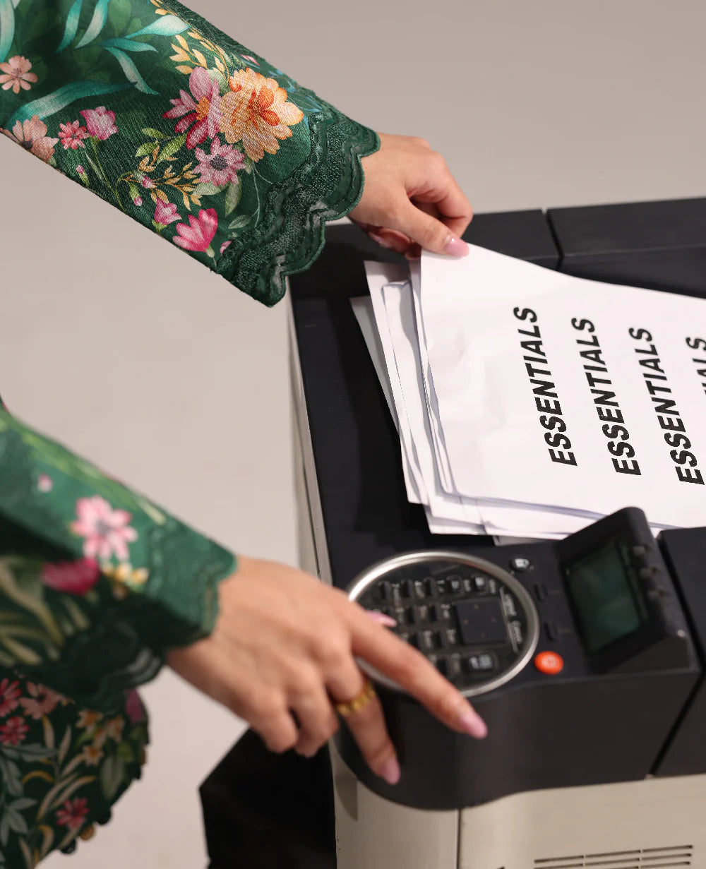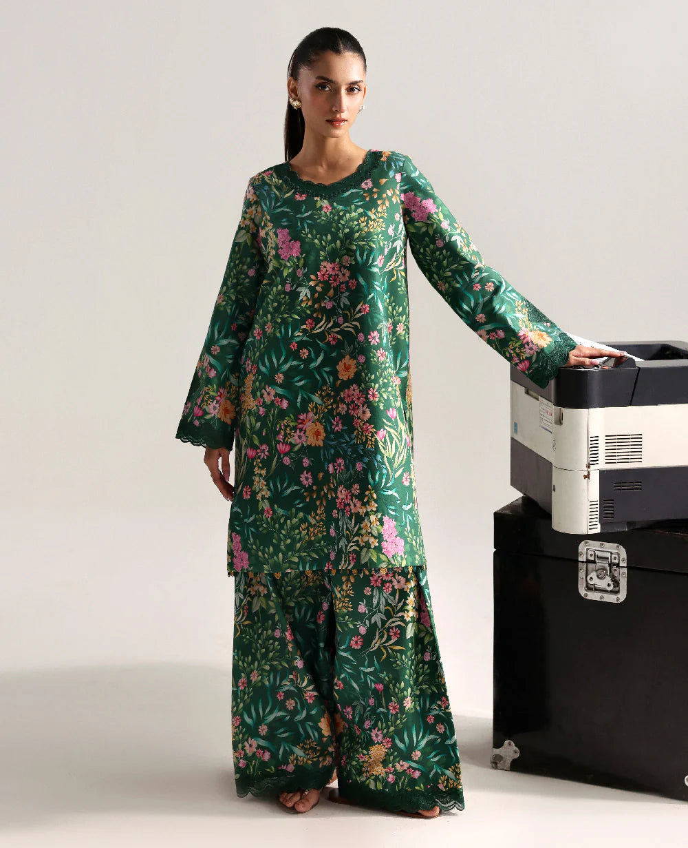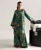 Gear up your style with all over floral pattern cord set of vibrant florals and green foliage elements finished with an embroidered edgy neckline, long sleeves, paired with straight trouser.