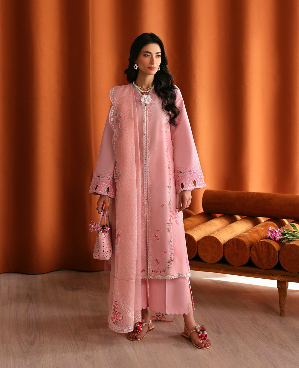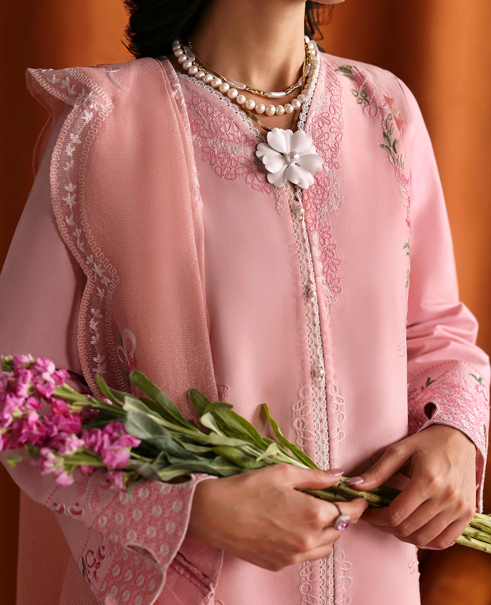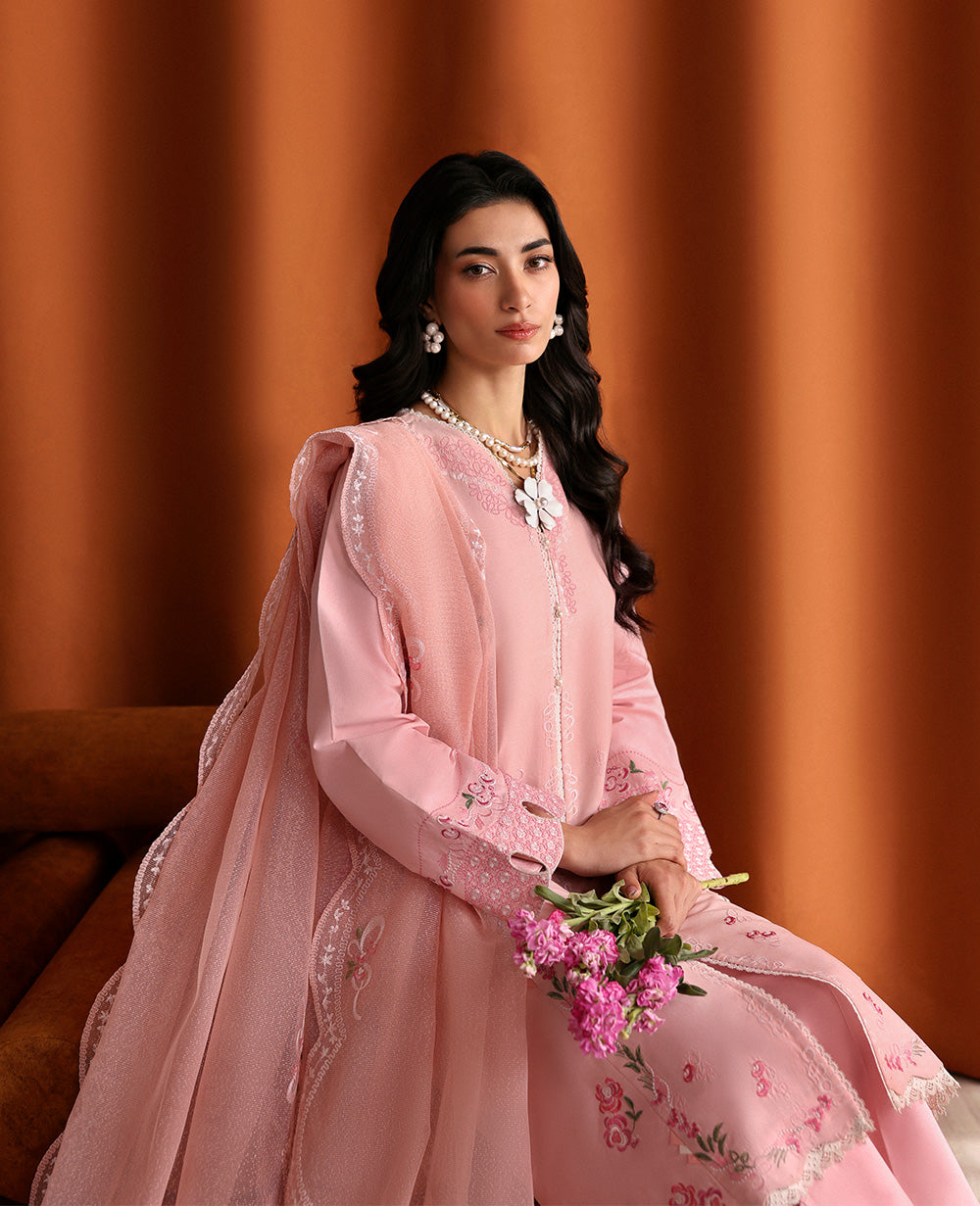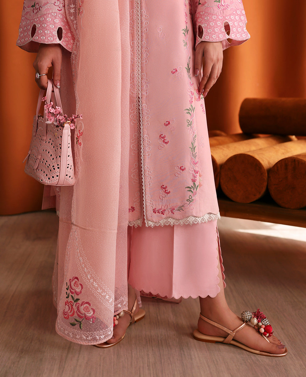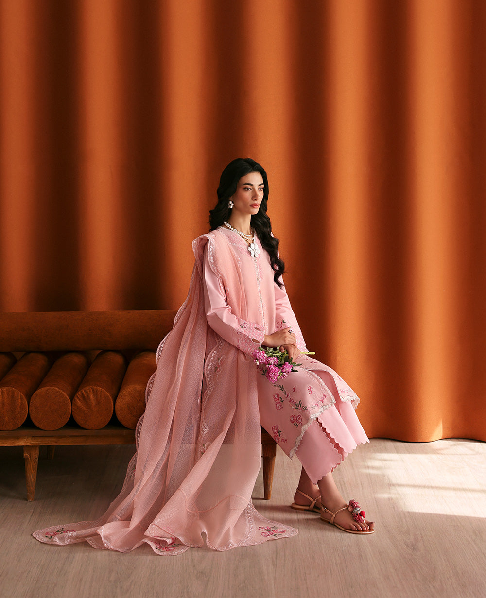 “Lila” is a perfect blend of traditional Parsigara-inspired embroidery and modern design. The soft lawn fabric features intricate floral and abstract motifs in vibrant hot pink, off-white, and green hues. The chandheri net dupatta enhances its elegance, with a colorful embroidered border and scalloped details on the pallu, creating a lovely contrast against the sheer fabric. The comfortable cambric culottes with side cut accents and scalloped hems give the outfit a chic and contemporary touch. This ensemble is ideal for special occasions.