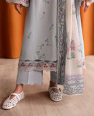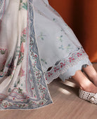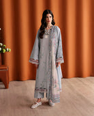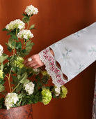 '‘Luna’, a stunning fusion of modern elegance and traditional craftsmanship. The long, dobby shirt features intricate leafy embroidery in subtle shades of white, blue, and mint green, adding a fresh, nature-inspired element. The organza border embroidery in bold reds and white creates eye-catching accents, while the running spray embroidery along the sleeves and contrasting embroidered edges along the borders create a modern refined aesthetic. The comfortable cambric culottes with weave detailing add an intricate and sophisticated touch, while the contrasting printed slub monar dupatta, adorned with a botanical printed border, ties in beautifully with the shirt’s embroidery and creates a delicate, textured finish that complements the entire look perfectly.