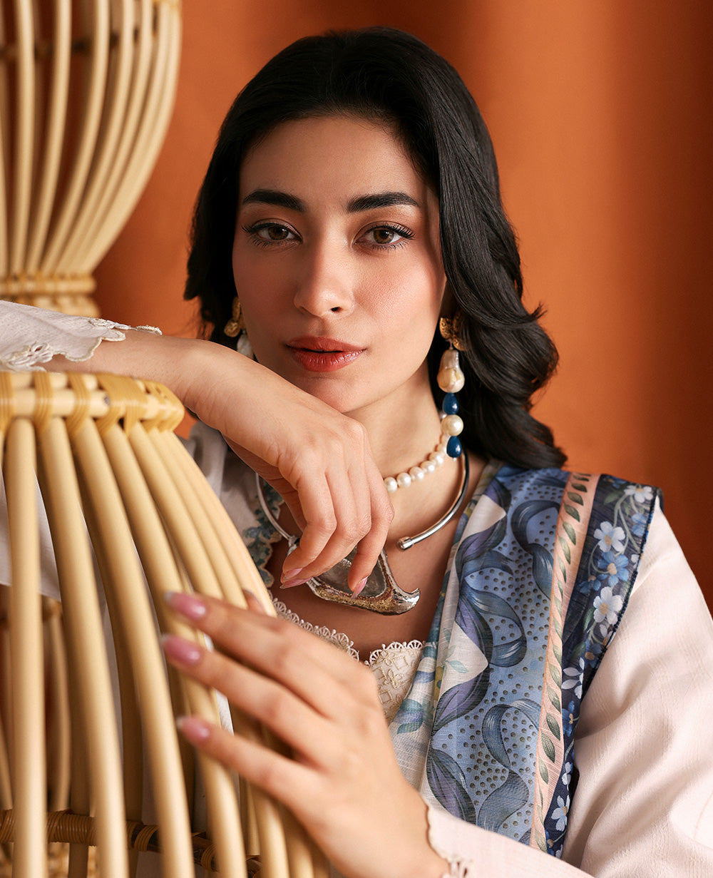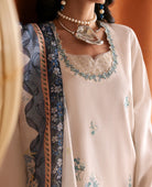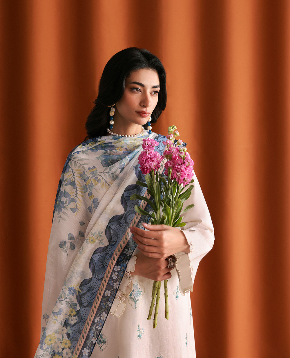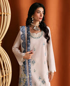 'Sorelle, is a stunning fusion of traditional style and modern sophistication. The long three-panel dobby kurta features exquisite floral embroidery, while geometric flames and a box border provide a structured and refined finish. The floral embroidered hem border with a navy blue printed border creates a captivating contrast. The printed silk monar dupatta in soft pastel yellow and light blue harmonizes beautifully with the shirt’s embroidery. The cambric crafted culottes trousers are comfortable and elegant, complementing the intricate embroidery perfectly.