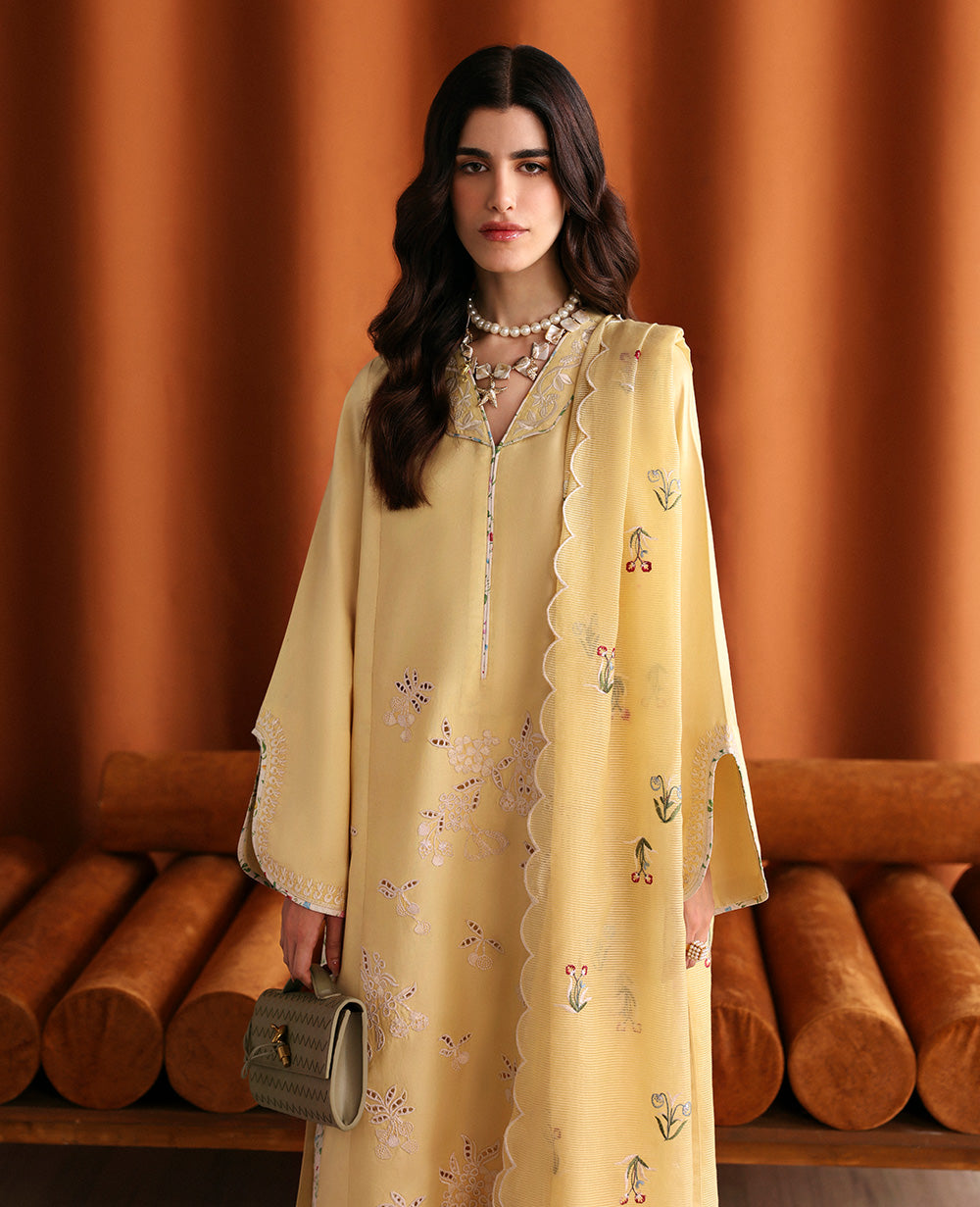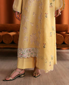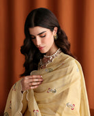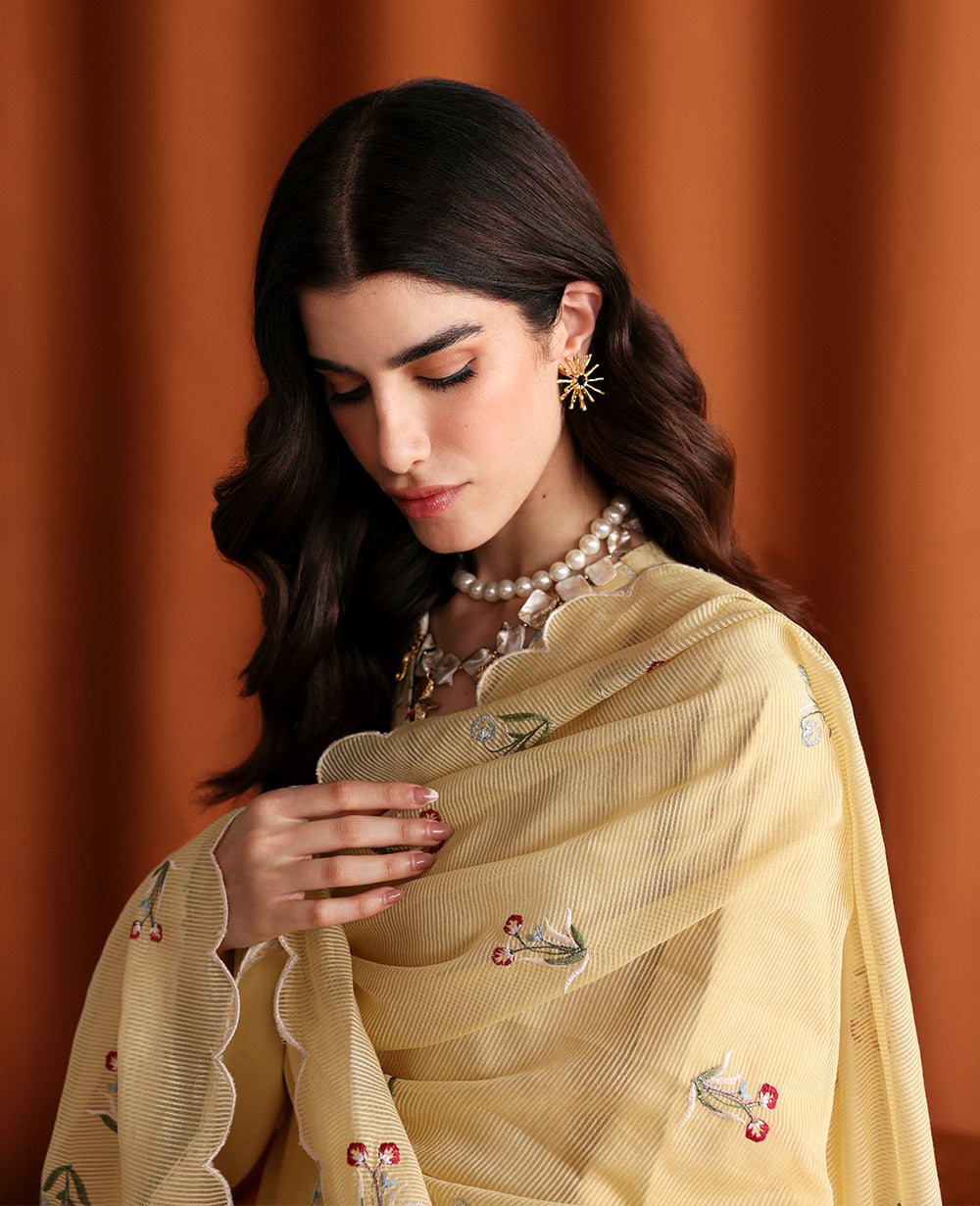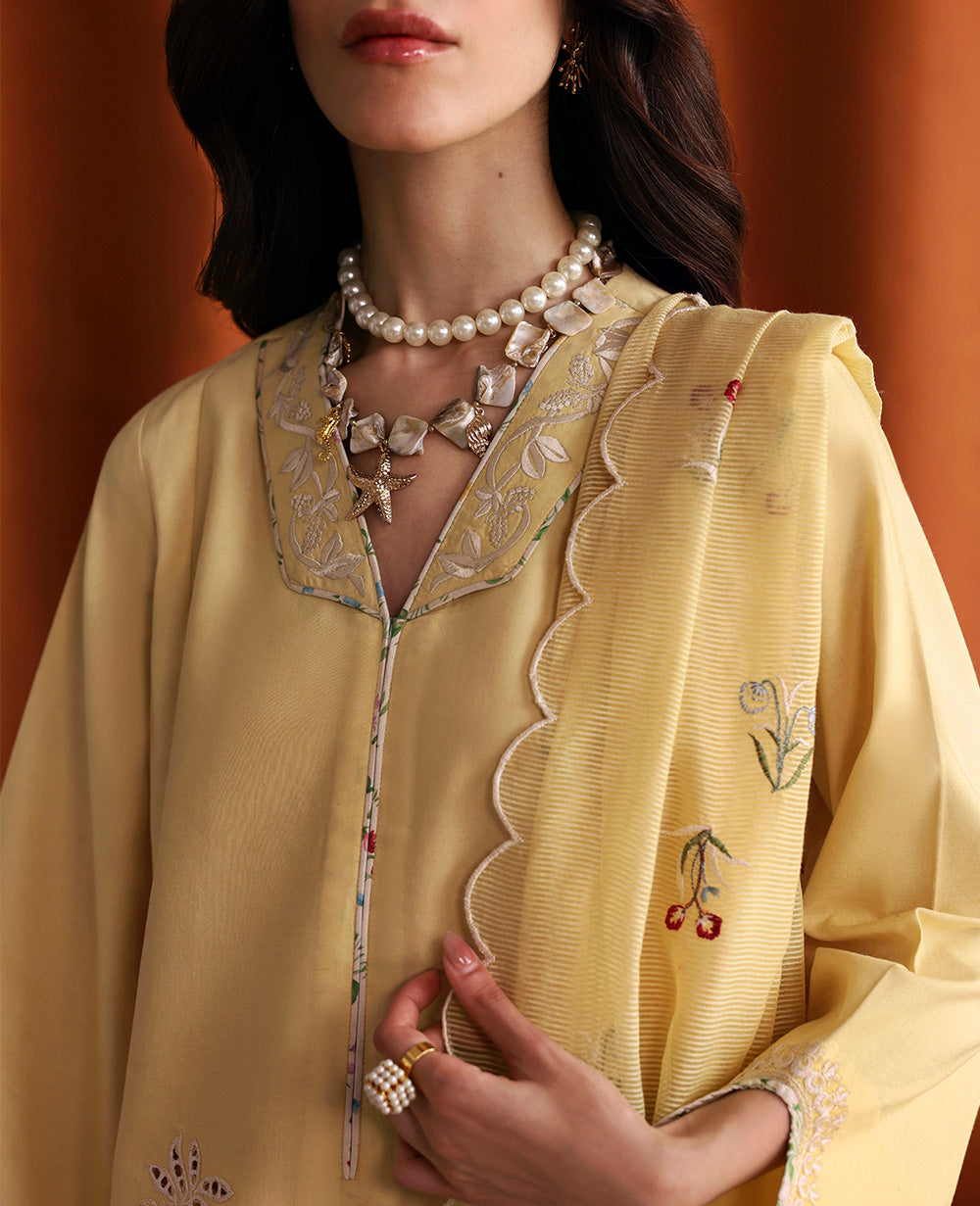 'Kymani seamlessly blends traditional elegance with modern flair. The vibrant yellow, three-panelled shirt is a statement of sophistication and contemporary style. Intricate white embroidery, featuring French cutwork adds a delicate touch to the center panel. The modern neckline paired with a printed facing creates a unique visual contrast. The shirt features a contrasting white printed hem, adding a subtle yet striking detail. Side slits with a printed Mughal border accentuate the traditional style while maintaining a contemporary feel. The sleeves, with their front cut curve and scalloped hem are beautifully detailed with white embroidery and printed facing. The cambric trousers with their curved hem and side cut detail offer a trendy and comfortable fit. They complement the shirt's intricate design with a sleek and tailored cut. The chandheri net dupatta adds a touch of ethereal beauty to the ensemble.